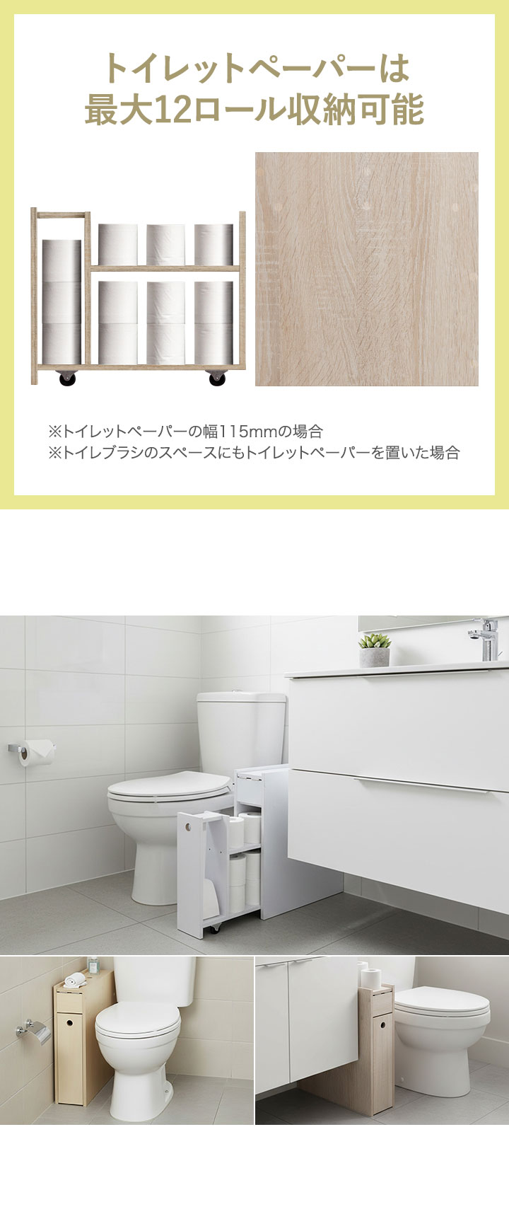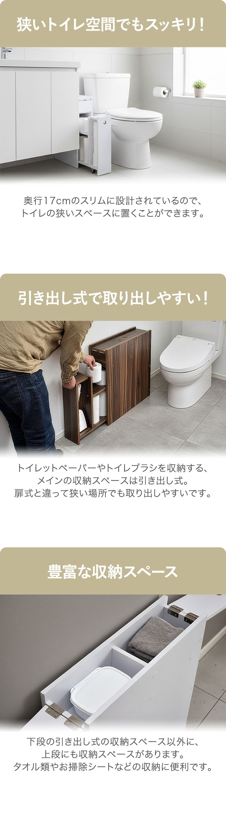 トイレットペーパーやトイレブラシを収納する、メインの収納スペースは引き出し式。扉式と違って狭い場所でも取り出しやすいです。
