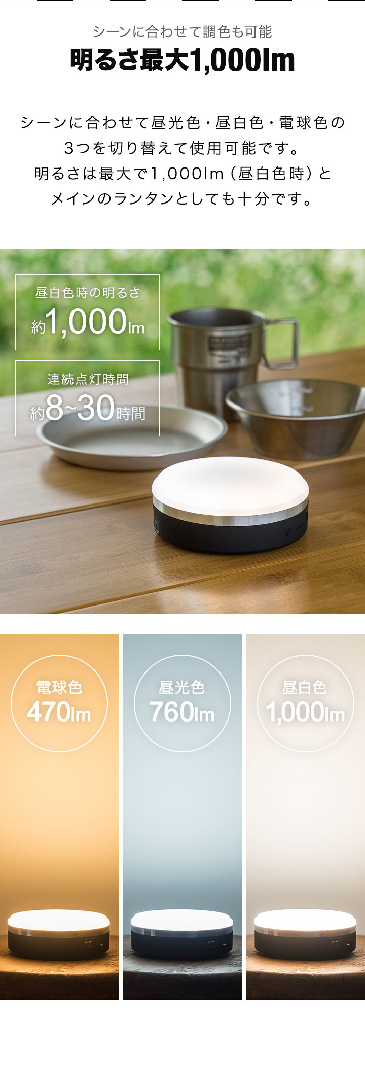 | 連続点灯時間: (約)8〜30時間 |