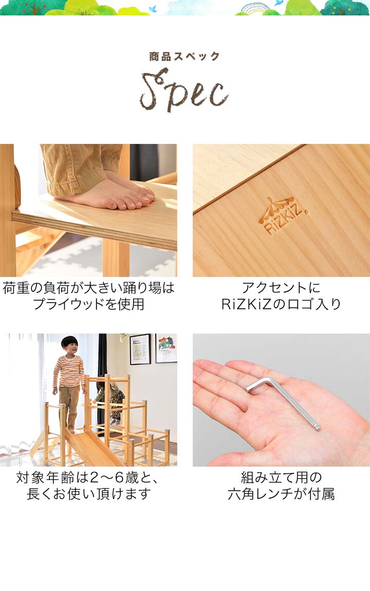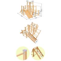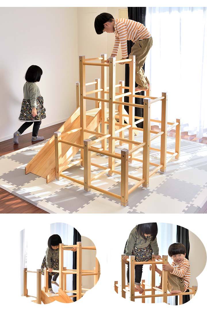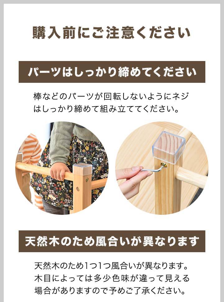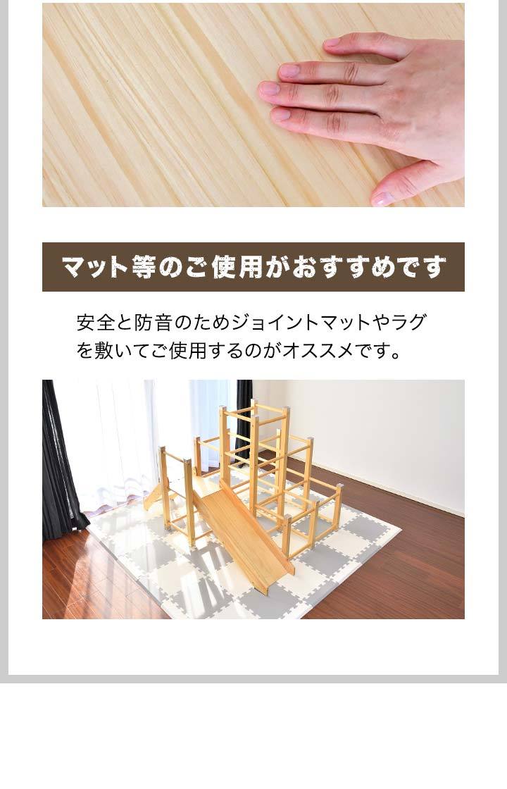 | 特記事項: ※絨毯の上など不安定な場所に置かないでください。転倒してケガや破損の原因になります。 ※本製品は室内専用です。屋外で使用しないでください。破損の原因になります。 ※火のそばに近づけて設置しないでください。火災の原因になります。 ※本体を水につけたり、水のかかる場所で使用しないでください。カビ・変色・変形の原因になります。 ※お手入れに塩素系・酸性タイプ等の洗剤は絶対に使用しないでください。カビ・変色したり、有毒ガスの発生により健康を害す事があります。 ※3人以上で同時に乗らないでください。 ※お子様がご使用の際は、けがをしたり、事故が起きないよう、必ず保護者の方が付き添い、目を離さないようご注意ください。 ※ご使用前、ご使用後は必ず点検を行ってください。万が一破損や異常があった場合は使用を控えてください。 ※荷重の負荷が大きい踊り場部分のみ、強度の有るプライウッドを使用しています。プライウッドは薄くスライスした木材を交互に貼り合わせているので、一枚板の無垢材よりも高い強度があります。 |