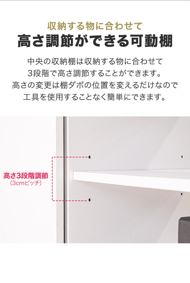 中央の収納棚は収納する物に合わせて3段階で高さ調節することができます。