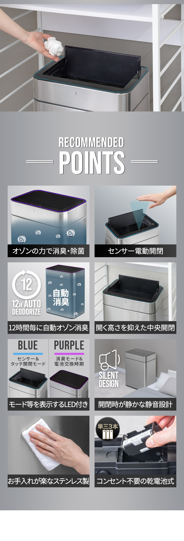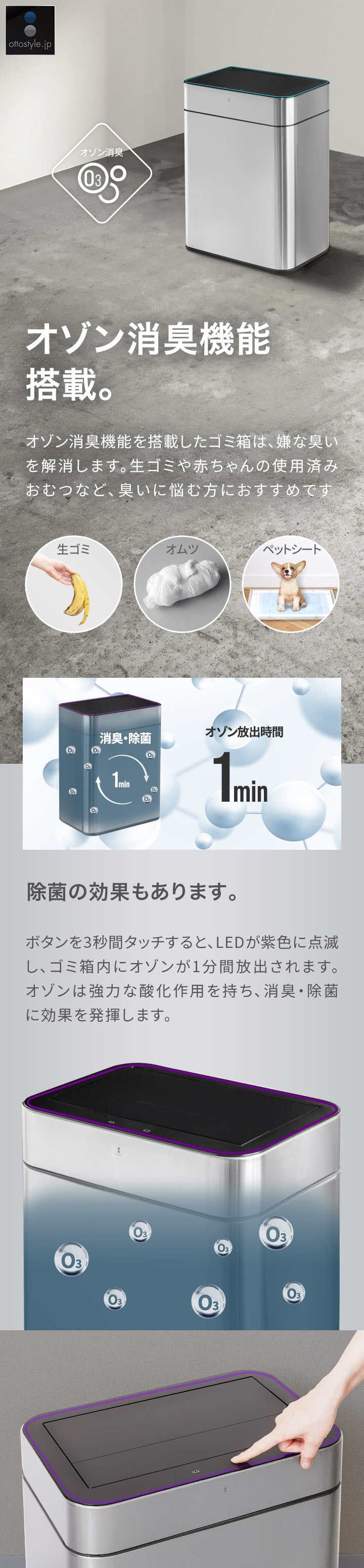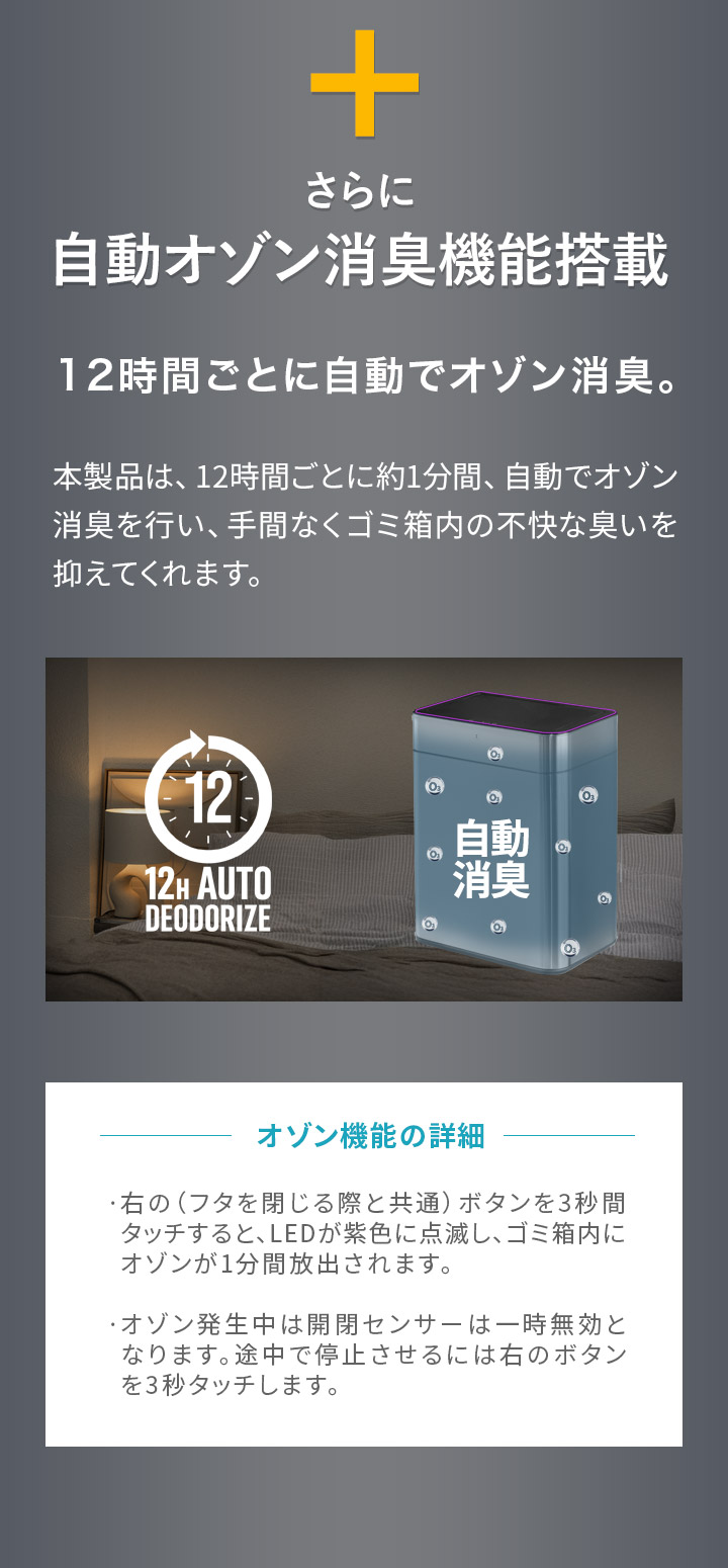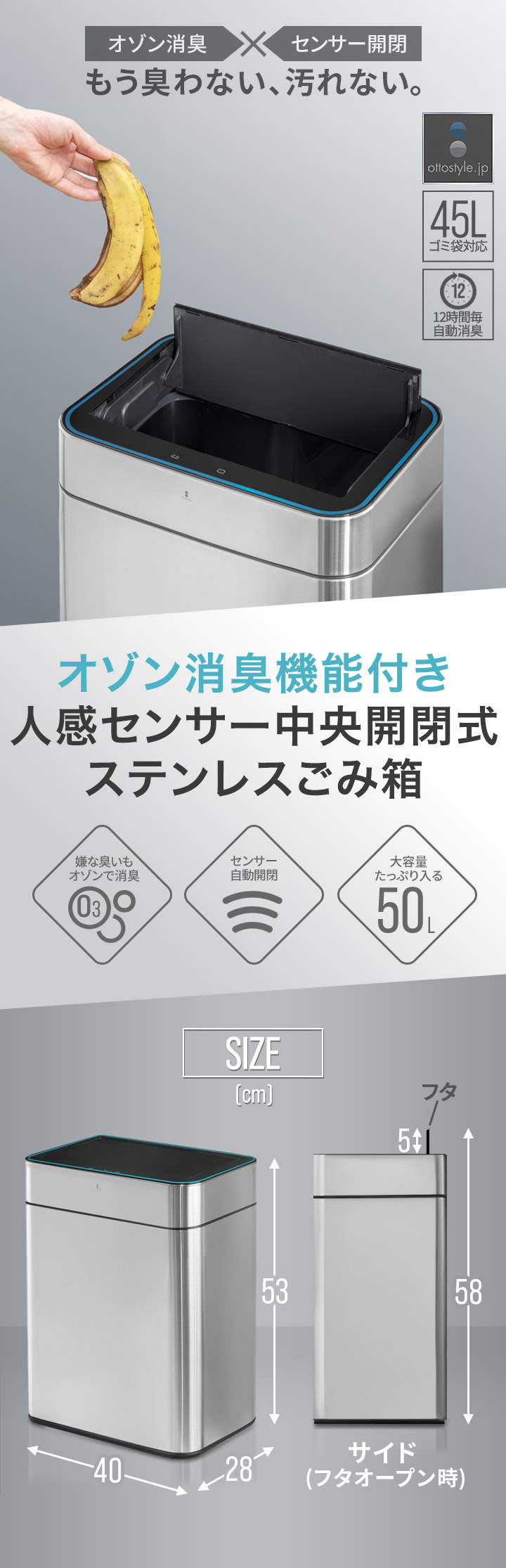 | 商品詳細(オゾン消臭機能付き 人感センサー中央開閉式ステンレスごみ箱 50L) |