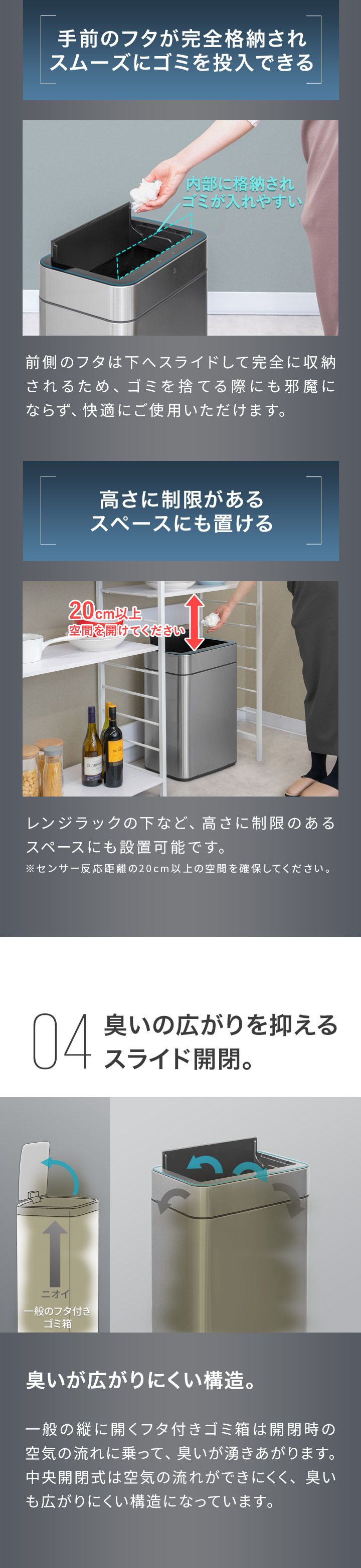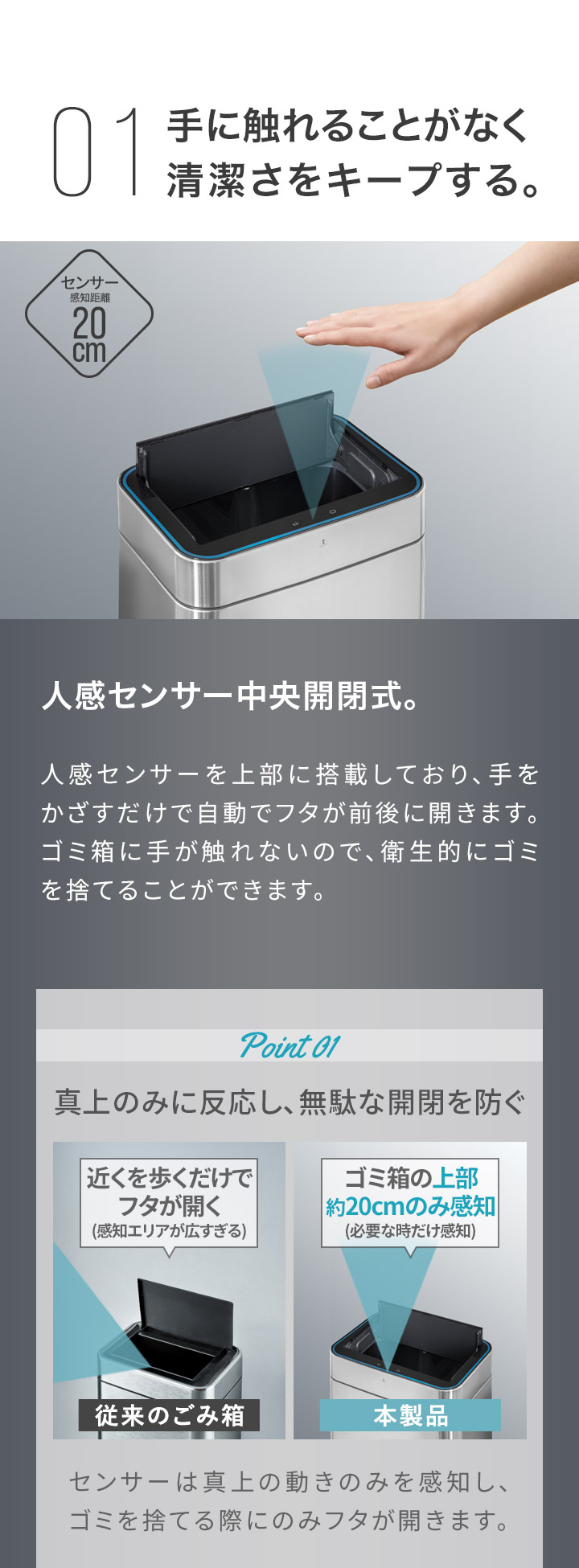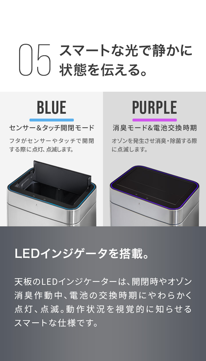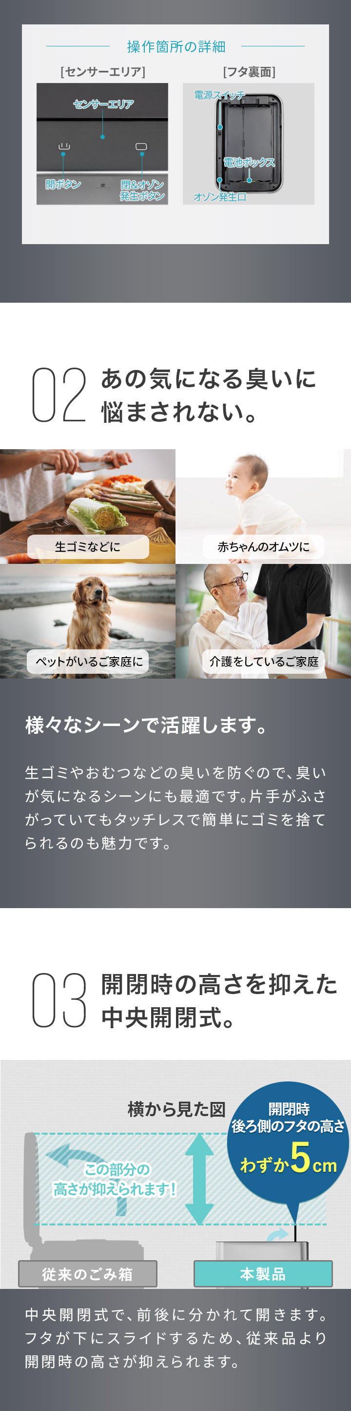 | 商品詳細(オゾン消臭機能付き 人感センサー中央開閉式ステンレスごみ箱 50L) |