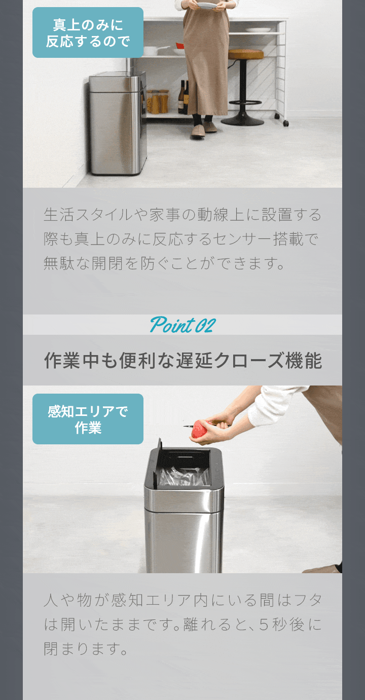 | 特記事項: ・本商品に乾電池は付属しておりません。 ・電池は新品のアルカリ電池(日本メーカー)を使用し、新旧の電池を混ぜないようにご注意ください。 ・設置する場所や環境により誤動作したり、動作しない場合がございます。周りに干渉するような物が無い場所にて動作の確認を行ってください。 【動作についての注意】 開閉が遅くなったり、蓋が途中までしか開閉しない場合、電池の残量が少なくなっている可能性があります。 必ず全て新品のアルカリ電池に交換して動作確認を行ってください。 ※古い電池が混じっているとパワーが足りず動作に異常が出る可能性があります。 【蓋のお手入れについての注意】 さっと水拭きして頂くだけで簡単にお掃除ができますが、水を多く含んだ状態で水拭きを行うと蓋の隙間から水が浸入し破損の原因となります。 水拭きを行う際は固く絞り、水をよく切ってから行ってください。 【設置場所についての注意】 蓋に水がかかってしまうような場所には設置しないでください。 水が蓋に入り込んでしまうと破損の原因となります。 |