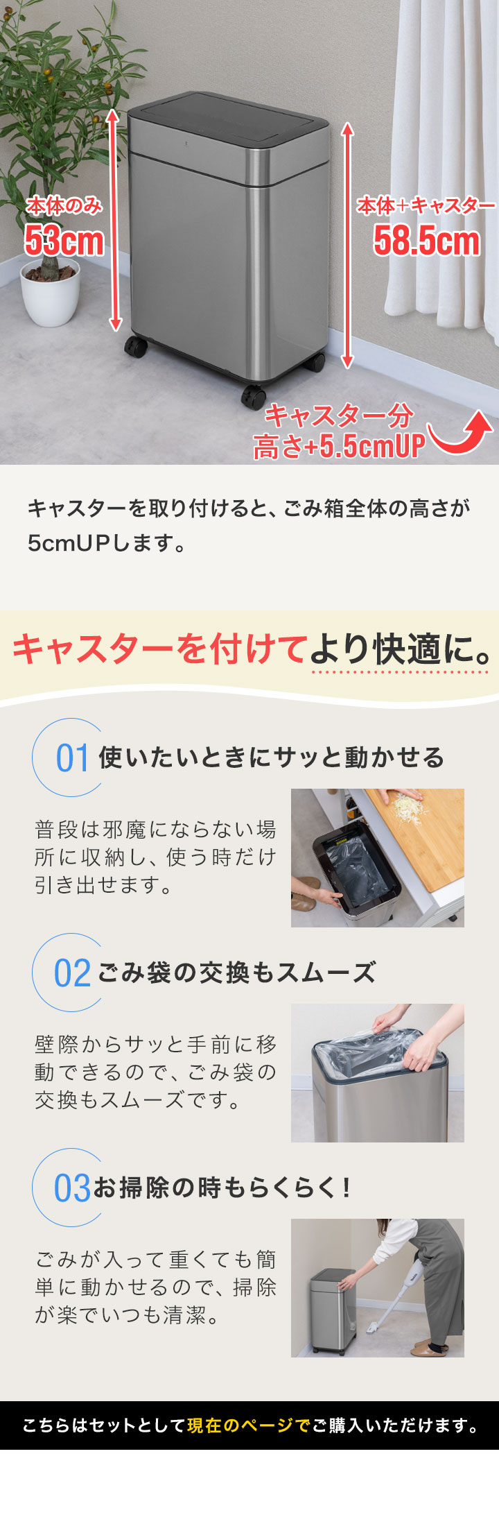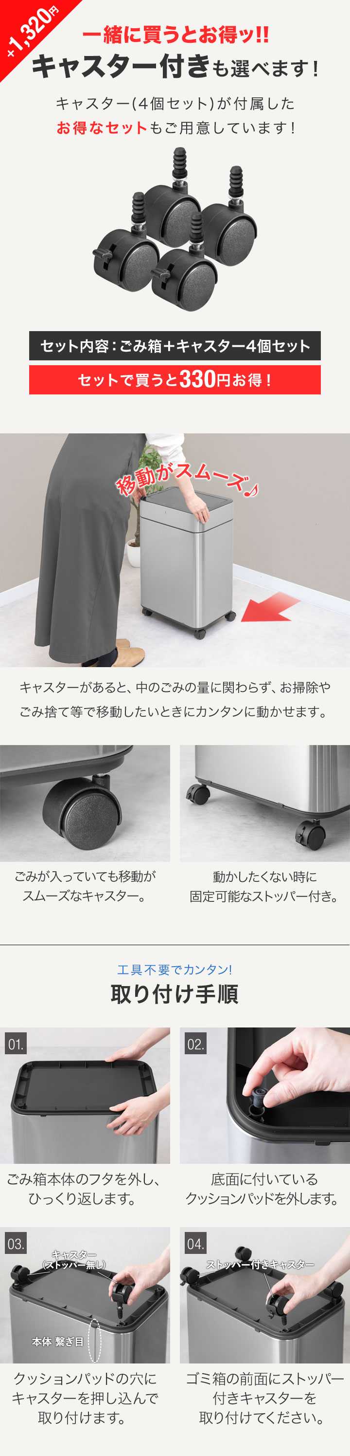 | 特記事項: ・こちらのキャスターは「オゾン消臭機能付き 人感センサー中央開閉式ステンレスごみ箱 50L」用となります。 |