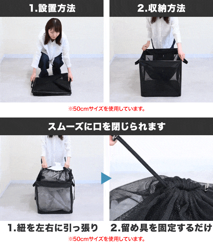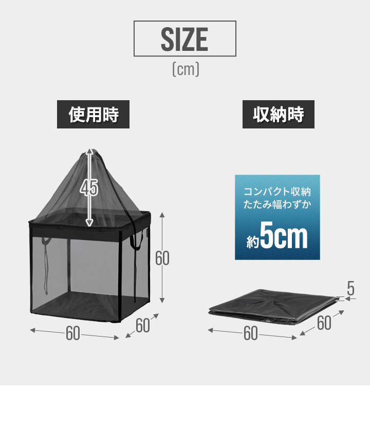 | サイズ: 使用時:(約)幅60cm×奥行60cm×高さ60cm + 45cm(巾着部分) 収納時:(約)幅60cm×奥行60cm×高さ5cm |