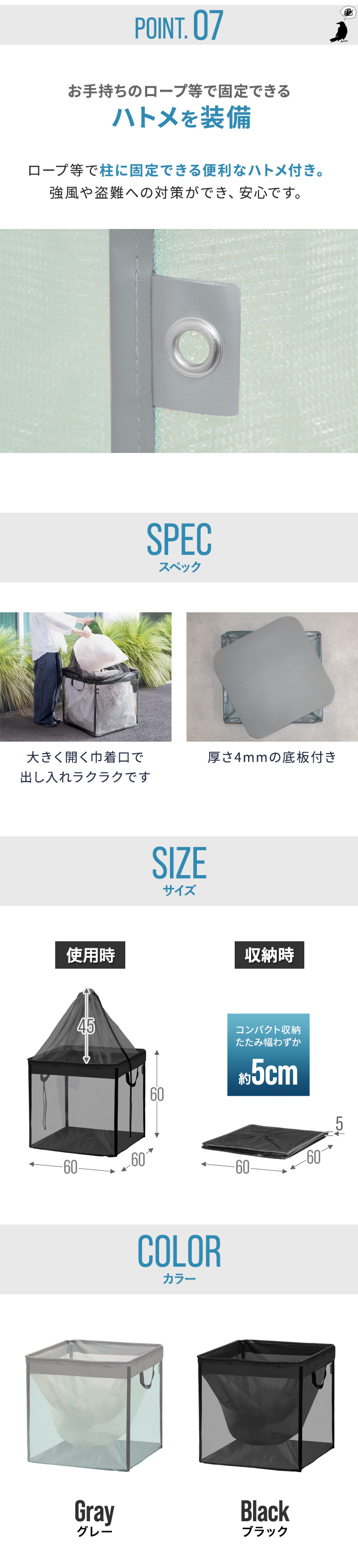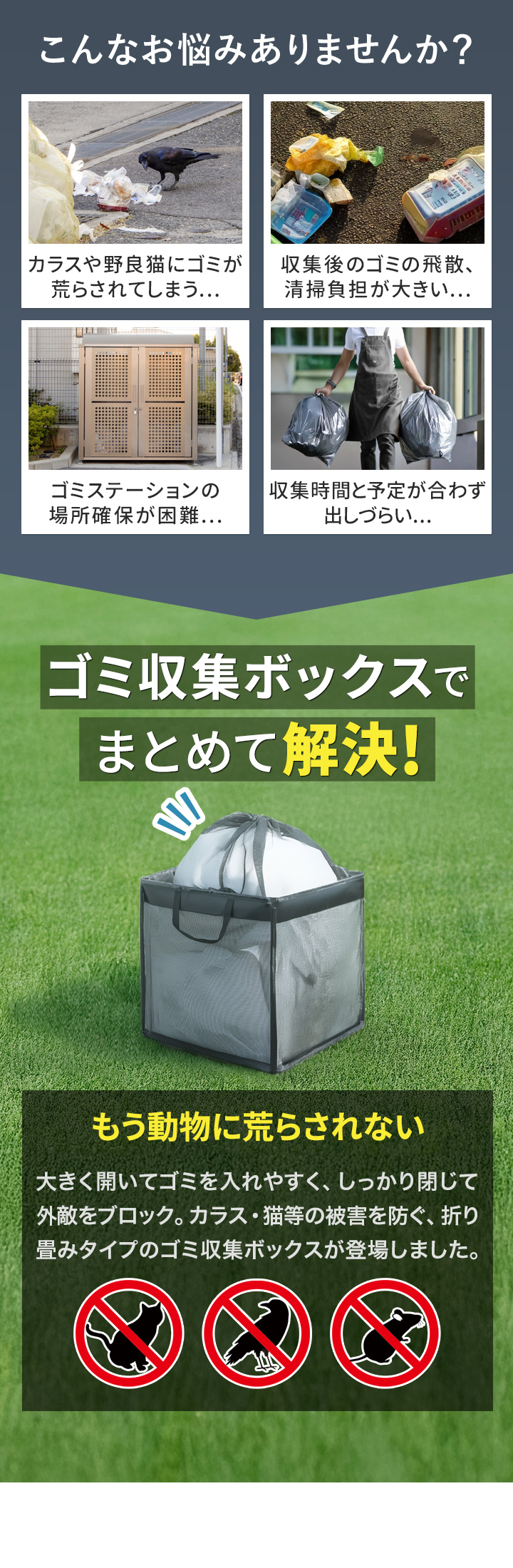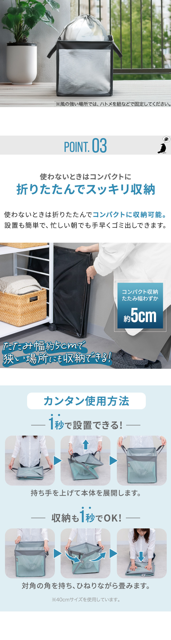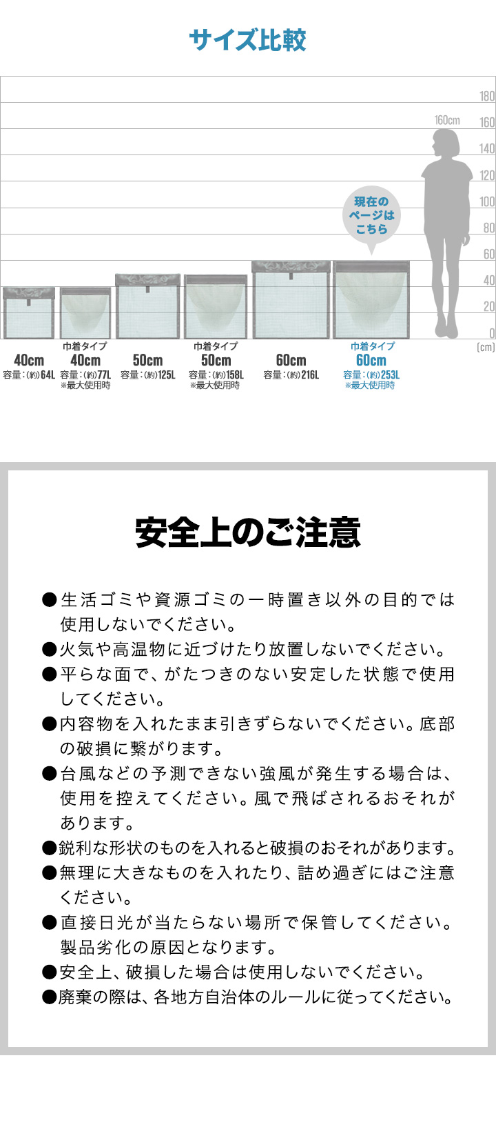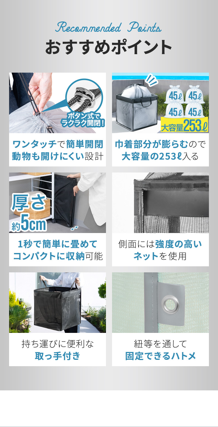 | 安全上のご注意: ・生活ゴミや資源ゴミの一時置き以外の目的では使用しないでください。 ・火気や高温物に近づけたり放置しないでください。 ・平らな面で、がたつきのない安定した状態で使用してください。 ・内容物を入れたまま引きずらないでください。底部の破損に繋がります。 ・台風などの予測できない強風が発生する場合は、使用を控えてください。風で飛ばされるおそれがあります。 ・鋭利な形状のものを入れると破損のおそれがあります。 ・無理に大きなものを入れたり、詰め過ぎにはご注意ください。 ・直接日光が当たらない場所で保管してください。製品劣化の原因となります。 ・安全上、破損した場合は使用しないでください。 ・廃棄の際は、各地方自治体のルールに従ってください。 |
