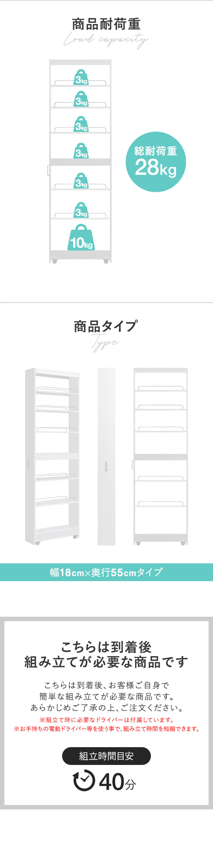 | 耐荷重: 1〜6段目:(約)3kg 最下段:(約)10kg 全体:(約)28kg |