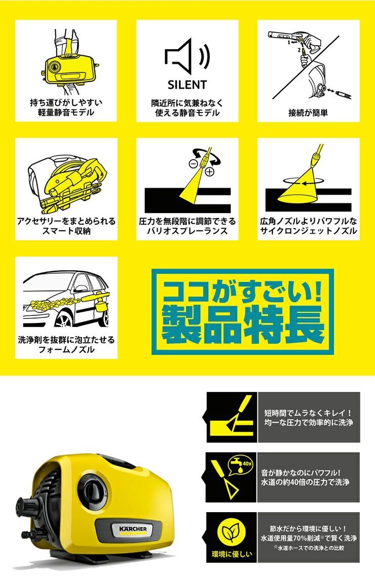 ★ 軽量タイプの静音高圧洗浄機K2シリーズで最もパワフルで、最も静かな高圧洗浄機です。2サイレントは、最大許容圧力は10Mpa、つまり、K3サイレントシリーズと同じのハイパワー(※)ながら、K2クラシックよりも騒音音圧は10dB低く、体感としては従来の半分程度の音です。(※水量の関係で、K3サイレントよりも実際の洗浄力は6パーセント低下しています。)