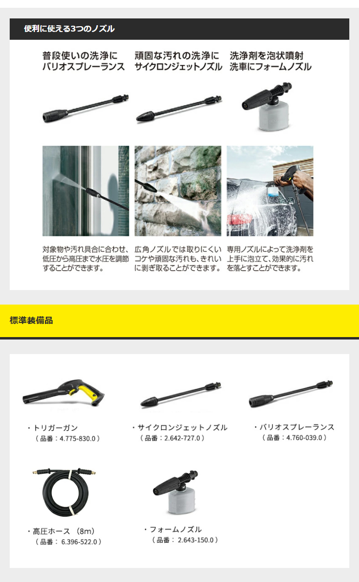 * 付属品: 電源コード5m・フック式トリガーガン・クイック式高圧ホース8m・バリオスプレーランス・サイクロンジェットノズル・フォームノズル・本体側カップリング・取扱説明書
