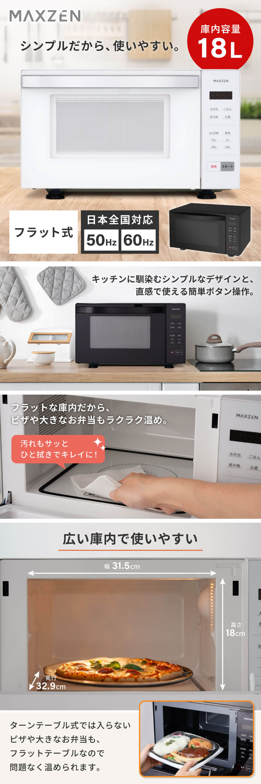 フラットな庫内だから、ピザや大きなお弁当もラクラク温め。汚れもサッとひと拭きでキレイに!