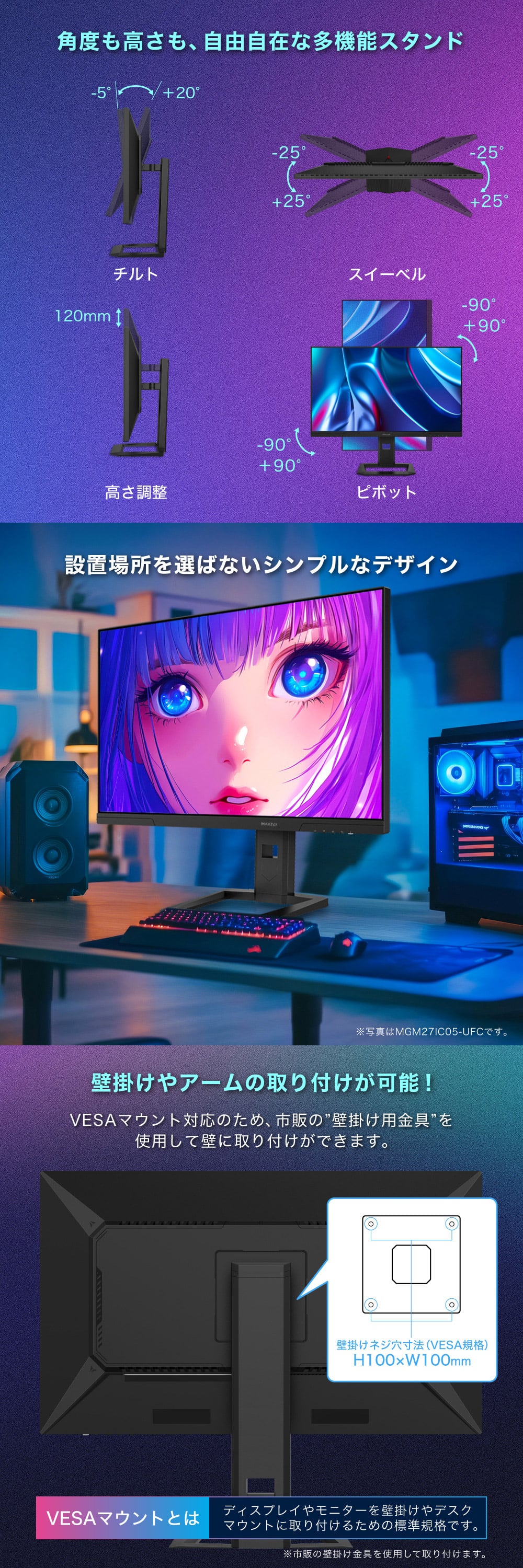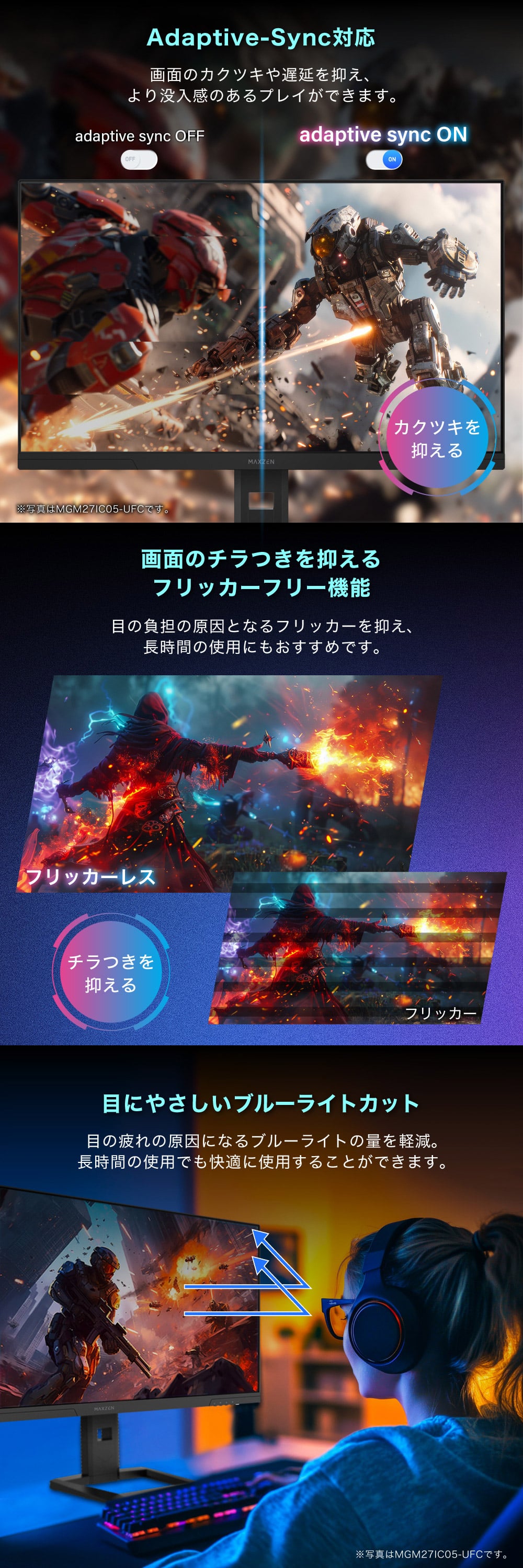* 機能:Adaptiv-sync、DCR、フリッカーフリー機能(ちらつき軽減)、ローブルーモード(ブルーライト軽減)、各種ゲーム設定、ピクチャー設定、色設定、ナイトビジョンモード、Geme+機能設定(AIデュアルモード、オールゲームモード、ゲームアシスタント、ダイナミックOD)、省エネ設定など