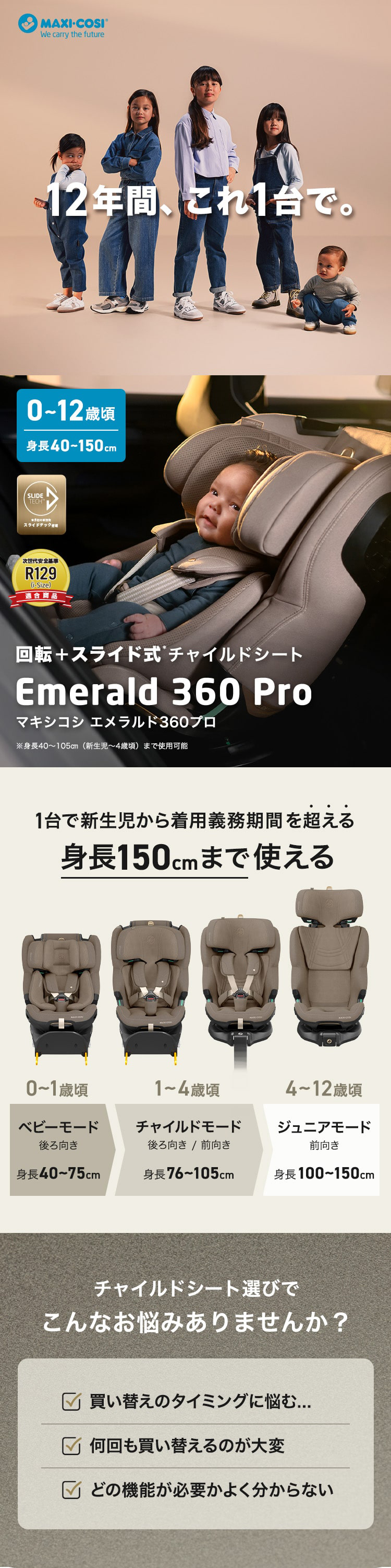 ★ Emerald 360 Proは、産まれてすぐの新生児からジュニアシート卒業の12歳まで、わずか1台で全ての対象年齢をカバーする超ロングユースチャイルドシートです。