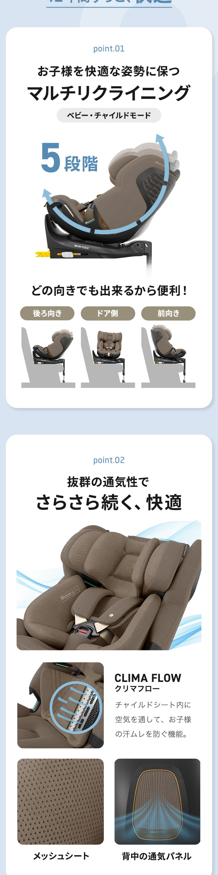 お子さまの頭と首を保護する独自開発のエアクッション・ハニカムセルで側面衝突の衝撃を吸収する特許技術G-CELL・通気性を高めるマキシコシ独自開発のCLIMA FLOW・肩ベルトと股パッドが跳ね上がるオープンハーネス搭載で、安全・快適を提供します