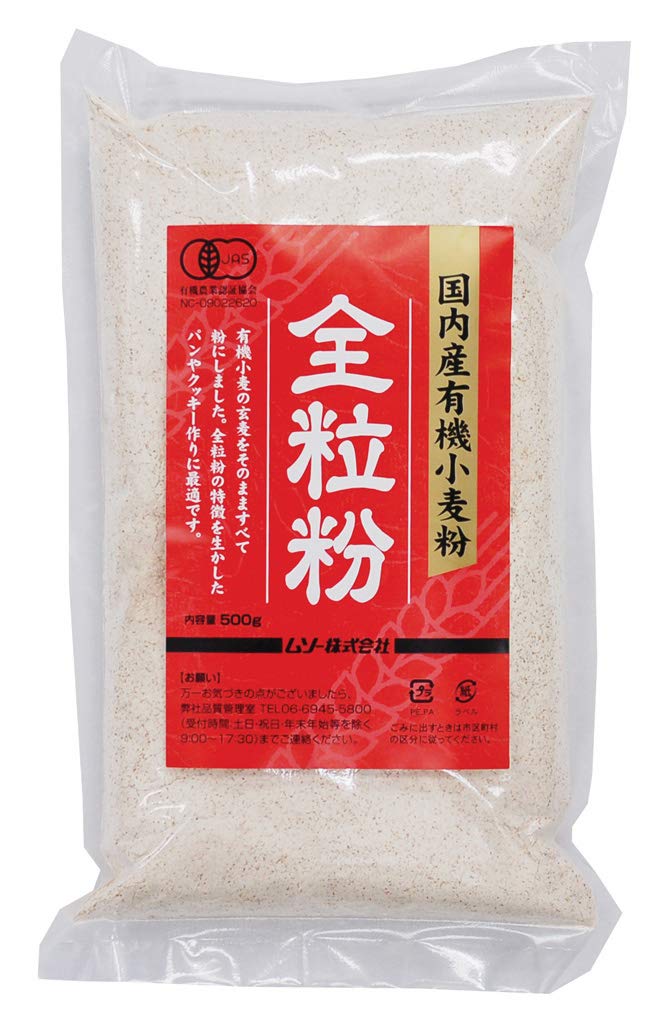 商品紹介創業昭和44年で、大阪のマクロビオティック専門メーカーであるムソーのオリジナル商品です。生産者を厳選した国内産有機小麦を丁寧に製粉しました。お菓子作りやパン作りにおすすめしております。国内産有機小麦を、ふすまや胚芽を残して粉にしました。 有機JAS認定の全粒粉です。 中力小麦をふすまや胚芽を残して製粉した全粒粉です。 タンパク質(グルテン)は8.1%前後になります。原材料・成分有機小麦(国産)