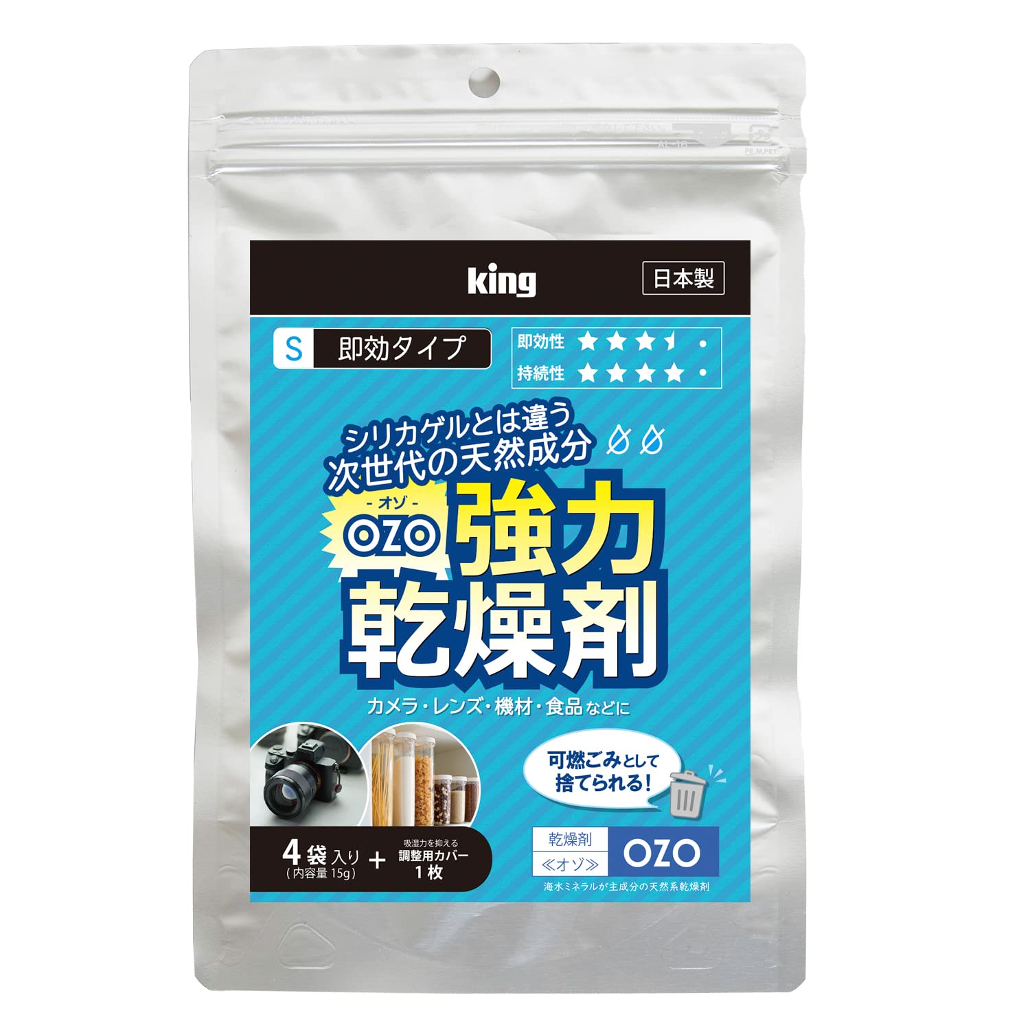 商品紹介●強力乾燥剤 OZO-S15 即効タイプは海水ミネラルを主成分とした天然系型の乾燥剤です。●シリカゲルの4~7倍の吸湿力を持ち、容器内の湿度を急速に下げることが出来ます。(S即効タイプ:約24時間)●化学反応によって吸湿を行うので、気温に左右されずに常に一定の吸湿力を発揮します。●一度吸湿した水分は殆ど放出されない為、温度差による結露の予防にたいへん効果的です。●吸湿力調整用カバーが付属。湿度が下がり過ぎてしまう時に乾燥剤に被せて使用します。●海水ミネラルを主成分としている為、水に濡れても殆ど発熱せず、安心して使うことが出来ます。●天然系型乾燥剤の為、利用後は「可燃ごみ」として捨てることが出来ます。●商品パッケージにチャック付きアルミ密閉パックを使用しているので、乾燥剤の保存に便利です。受賞デジタルカメラグランプリ2021 周辺機器部門 収納清掃関連アクセサリー 金賞