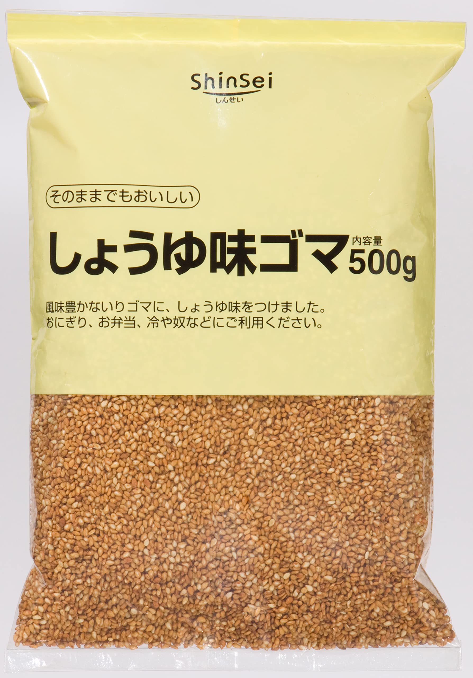 商品紹介味付ごまの中ではもっともメジャーなしょうゆ風味のごまです。ごまの表面に粉末状にした焦ししょうゆをコーティングしました。ごはんにふりかけるのはもちろん、おにぎりにまぶしたり、そのまま食べたりしょうゆの代わりに調味料としても使えます。一度食べたらやみつきになる味ゴマです。原材料・成分原材料:ごま