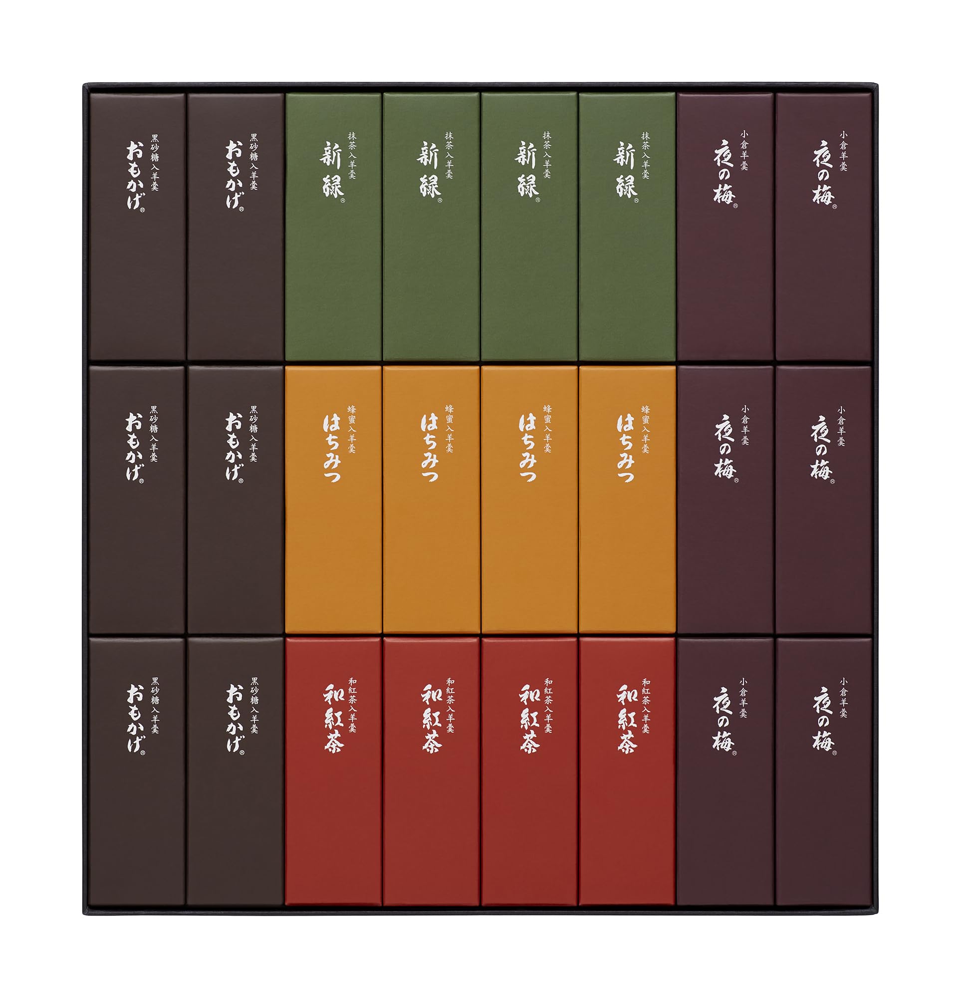 - 小形羊羹「夜の梅」「おもかげ」各6点、「新緑」「はちみつ」「和紅茶」各4点の詰合せ