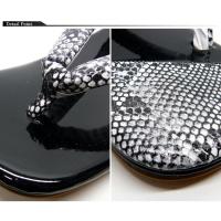 【ブランド名/商品名】黒パール蛇柄 雪駄/25ban【デザイン】新作の雪駄が登場です!!切り替えを施し、和柄デザインを貼り付けたデザイン。蛇柄の人気タイプです。踵を出して履くのが粋な履き方で、2cm程度は踵がでても気になりません。祭りや散歩にも超おすすめです!【サイズ】(M)長さ25cm/幅10cm(L):長さ27cm/幅10cm【素材】底:ライト底(合成革靴底)【品番】25ban