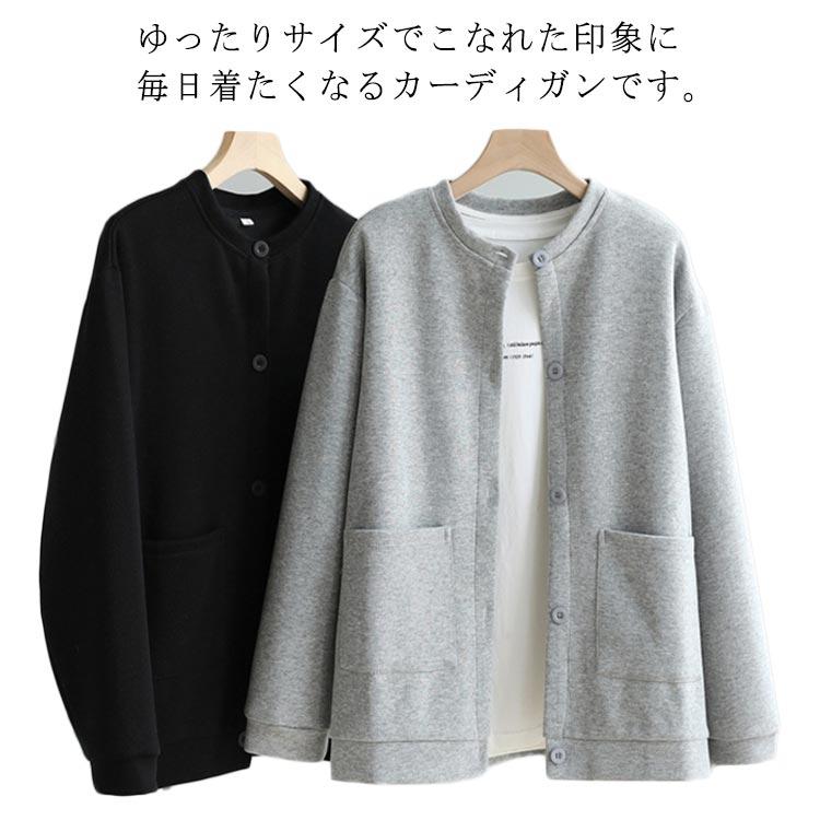 カーディガン レディース トップス カーデ 羽織り 長袖 丸首 クルーネック 前開き スウェット トレーナー ポケット付き 体型カバー ゆったり 春秋