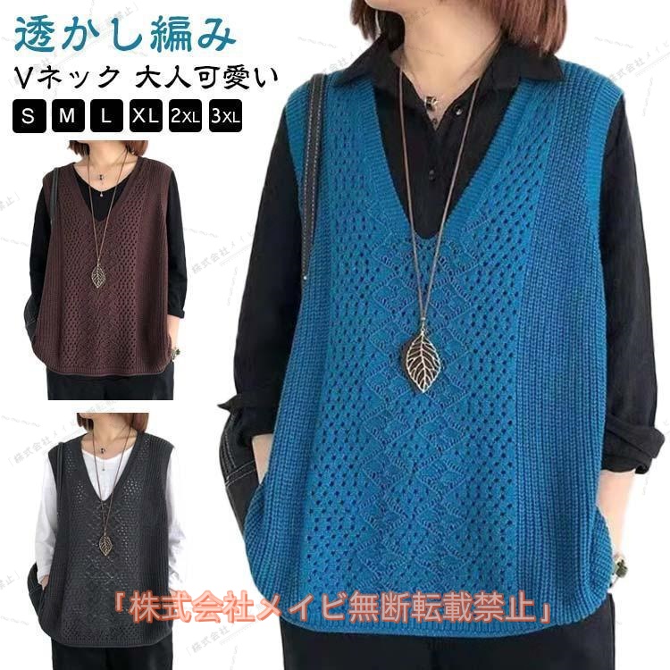 メイビニットベスト レディース 春 夏 秋 ベスト サマーベスト ジレ 透かし編み 薄手 プルオーバー 大きいサイズ トップス Vネック ニット ベスト ノ