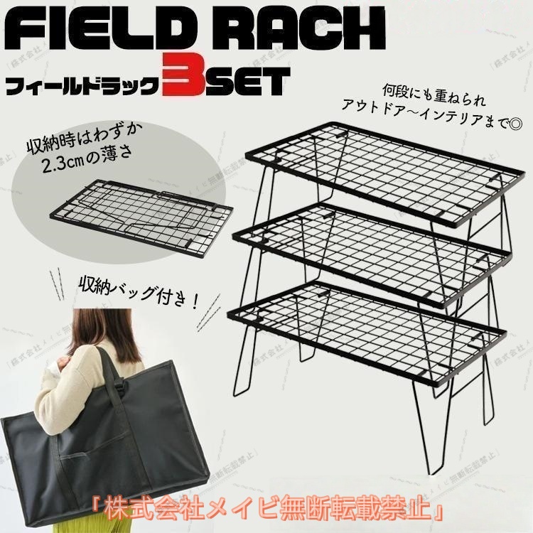 メイビフィールドラック アウトドアテーブル 収納袋付き 3セット 折りたたみ スチール 軽量 耐荷重30kg メッシュ アウトドア キャンプ コンパクト バーベキュー