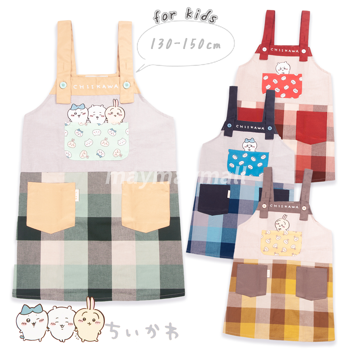 【詳細】商品名:【送料無料】ちいかわ キッズ エプロン 子ども 男の子 女の子 ハチワレ うさぎ 130 150cm 刺繍 アップリケ プリント かわいい チェック 子供 料理 実習 お手伝い プレゼント 新柄 キッズエプロン サイズ調整 ポケット ネームタグ