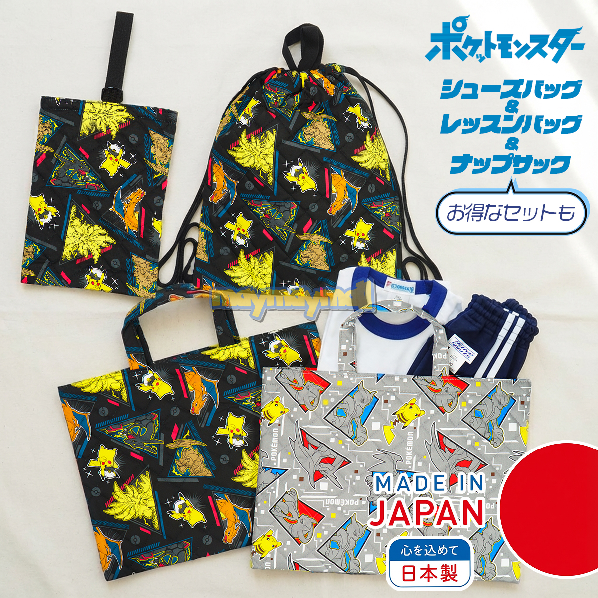 【詳細】商品名:ポケモン キルト シューズバッグ レッスンバッグ ナップサック セット 入園 入学 幼稚園 保育園 上履き入れ シューズ入れ 習い事 サブバッグ ポケットモンスター キャラクター 男の子 かばん 日本製 国産