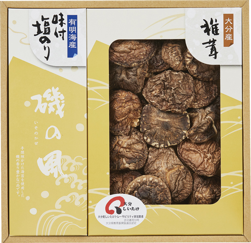 ●内容/大分産原木乾椎茸こうしん(30g)・有明海産味付塩のり(6切5枚×2袋)×各1