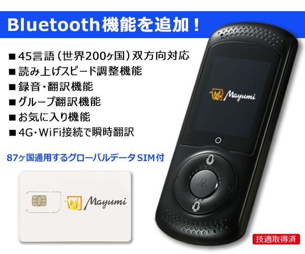 MayumiIIは45言語に対応、高精度のAI翻訳なのでスピーディーに双方向の翻訳が可能です。言語によって最適な翻訳エンジンを選び、AIが学習するので翻訳機精度が日々向上します。タッチパネル対応なので、聞くだけでなく、会話をスクロールして見ることができるのでコミュニケーションも円滑になります。随時更新・バージョンアップしますので、言語追加や翻訳精度もUPしていきます。Wi-Fi通信とSIMカードを使用すれば3G/4Gの高速通信でご使用いただけます。またWi-Fiルータ機能もあるので海外でWi-Fiルータ―をレンタルする必要がありません。SIMロックフリー対応なので目的に合わせたSIMカードをご選択いただけます。