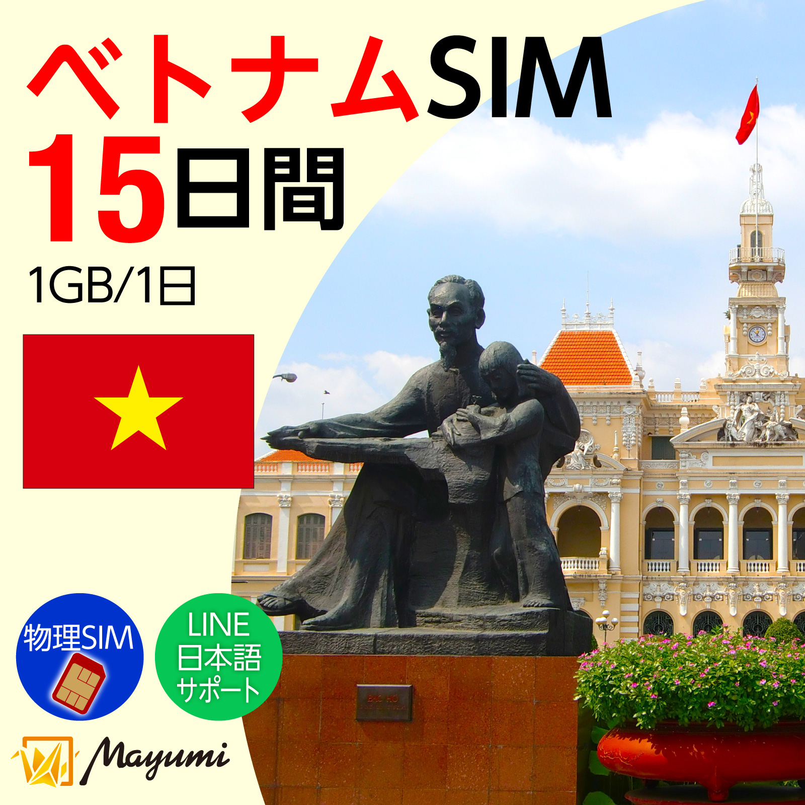 ベトナムデータSIM 1GB/1日 15日間有効 SIMカード リチャージ可能 テザリング可 海外SIM プリペイドSIM 海外出張 海外旅行 ワーホリ 短期留学 マユミ