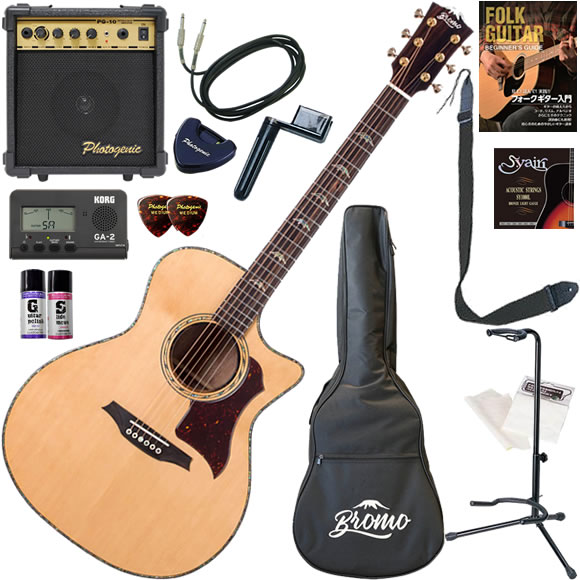 ヘッドロゴにはマザーオブパールのインレイが施され、さらにグロス仕上げによって、 Bromoの象徴的な山型デザインが一層際立っています。高級感あふれる仕上がりが、ギター全体の美しさを引き立てます。