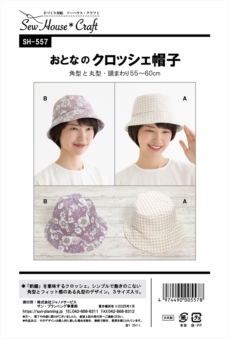 | タイプ:大人(頭まわり:55〜56cm、57〜58cm、59〜60cm の3サイズ) 「釣鐘」を意味するクロッシェ。 日差しが気になる季節に紫外線対策やアウトドアシーンなどで活躍するアイテムです。 シンプルでコーディネートに取り入れやすい角型と、頭のかたちにフィットする6枚はぎの丸型のデザイン2種。 深すぎないクラウンとブリムが、カジュアルにもフェミニンなスタイリングにもマッチします。 頭まわりに合わせて3サイズから選べ、フィットしたかぶり心地も手作りならでは! |