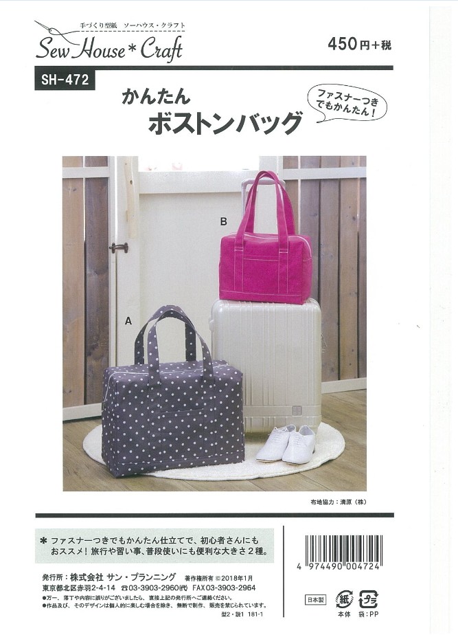 型紙 パターン かんたんボストンバッグ SH-472 SH472 ソーハウスクラフト サンプランニング 大人 子供 ベビー 赤ちゃん 作り方 洋裁 手作りバッグ作り方