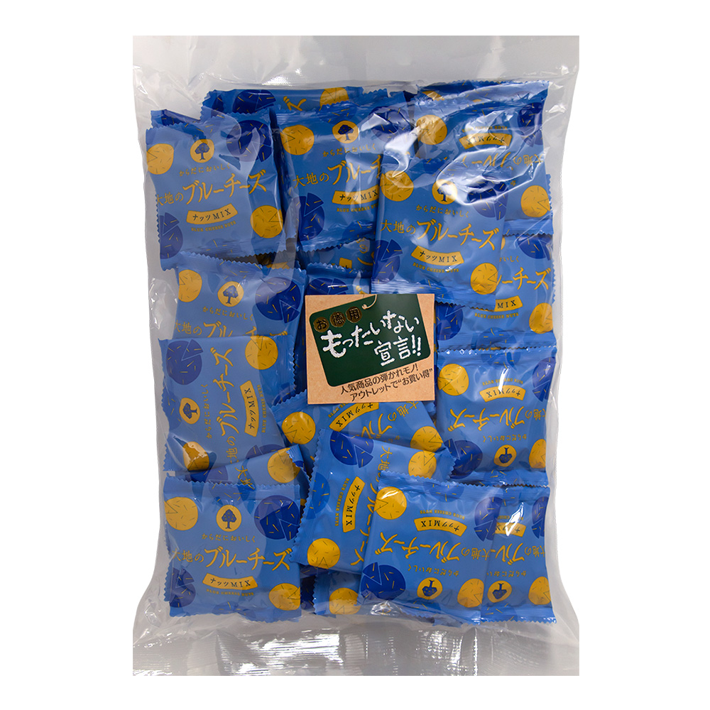 製造工程中に個包装の軽量・過量ではじかれた規格外品を集めた商品です。ブルーチーズの濃厚でリッチな香りが効いた味わい深いナッツミックスです。