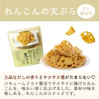 バキュームフライ製法で揚げたれんこんを、風味豊かなだし醤油味で仕上げました。素材の旨味が凝縮されたれんこんの天ぷらのスナックです。