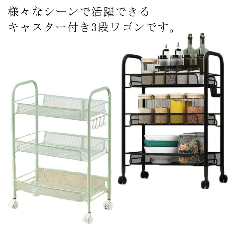 | 様々なシーンで活躍できるキャスター付き3段ワゴンです。 スチール製で頑丈です。 キャスター付きで移動も楽々! キッチン、お部屋、浴室やお庭様々な場所で使用可能! 使用する場所の雰囲気に合わせて4色から選択できる! メッシュ底板で水やホコリなどがたまりにくいです。 キャスター付きでスペースが活用できます。 | |