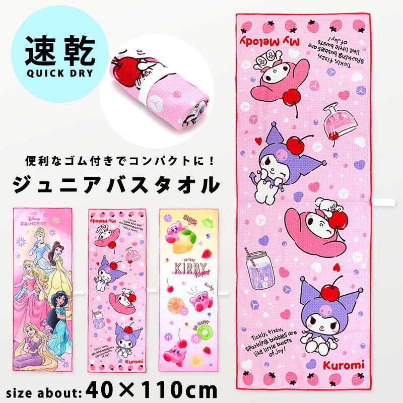 ジュニアバスタオル 速乾 スポーツタオル キッズ 子供 キャラクター 女の子 保育園 幼稚園 クロミ マイメロ カービィ プリンセス 40×110 //メール便発送可