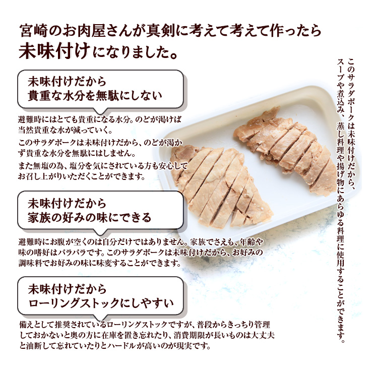 このサラダポークは未味付け、食塩不使用だから、のどが渇かず貴重な水分を無駄にはしません。