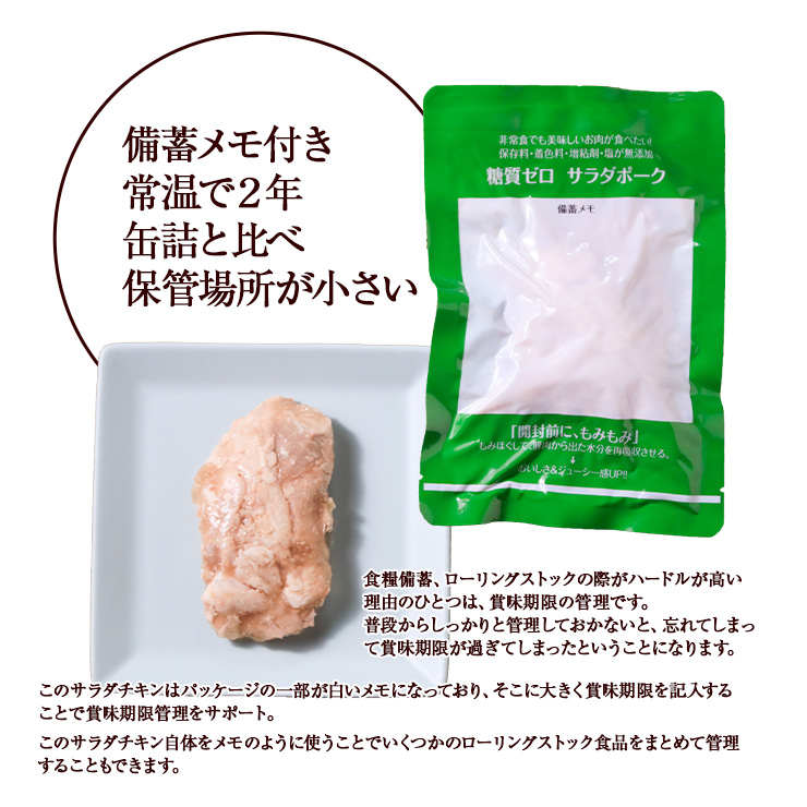 普段からしっかりと管理しておかないと、忘れてしまって賞味期限が過ぎてしまったということになります。このサラダポークはパッケージの一部が白いメモになっており、そこに大きく賞味期限を記入することで賞味期限管理をお助けいたします。他にもこのサラダポーク自体をメモのように使うことでいくつかのローリングストック食品をまとめて管理することもできます。