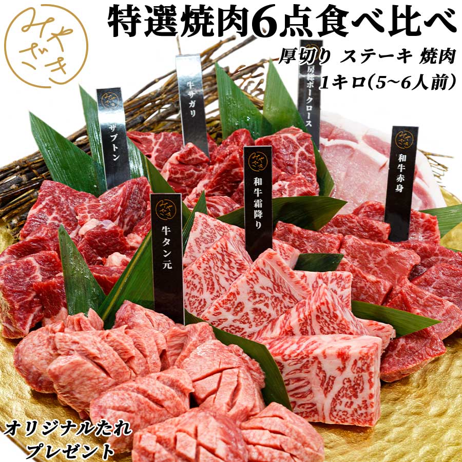ホワイトデー 誕生日 ギフト 送料無料※北海道、沖縄県を除く 厚切り 焼肉6点セット 食べ比べ 6種類 1キロ (5〜6人前) 冷凍 冷蔵 牛肉 豚肉 牛タン 赤身