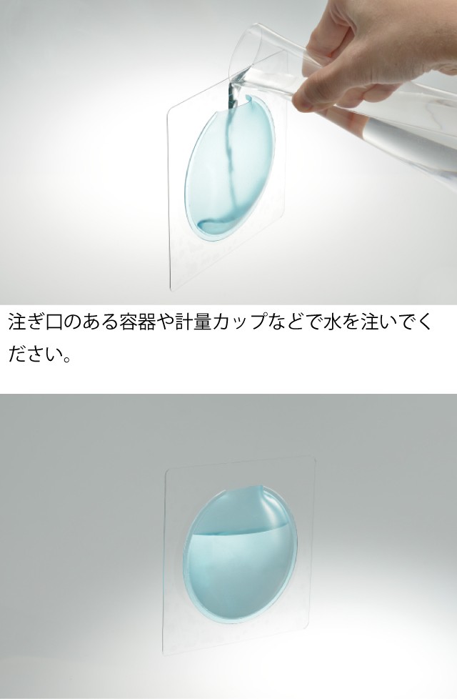 | 注意事項 | ※ 製品が白濁する事がありますが、品質上問題はありませんので、 安心してご使用ください。 ※柔らかい素材の為、製品表面に歪みが生じる場合がございます。 ※直射日光のあたる場所では使用しないでください。 ※凹凸、ザラザラ面には使用できません。 ※水を入れる前に、しっかり貼付けられているか、確認してください。 ※製品の貼付け面と、貼付ける平滑面に付着しているホコリや汚れを取り除き、空気が入らないように全面をきちんと貼付けてください。 ※水が入っている状態で製品を押すと水が溢れる恐れがあります。 ※精密機器などの近くでは使用しないでください。 ※製品を印刷物などの上に放置しないでください。製品にインクが移行する恐れがあります。 ※ご使用のモニターにより、色の見え方が異なる場合がございます。 |