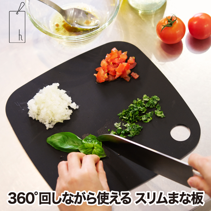 ●一辺25cm。狭いスペースでも回して使え、みじん切りや複数の食材を1つの面で切るのに便利です。