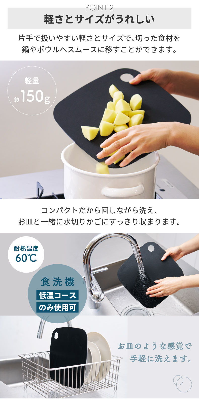 ●約150gの軽さと片手で扱いやすいサイズで、切った食材を鍋やボウルへスムースに移すことができます。