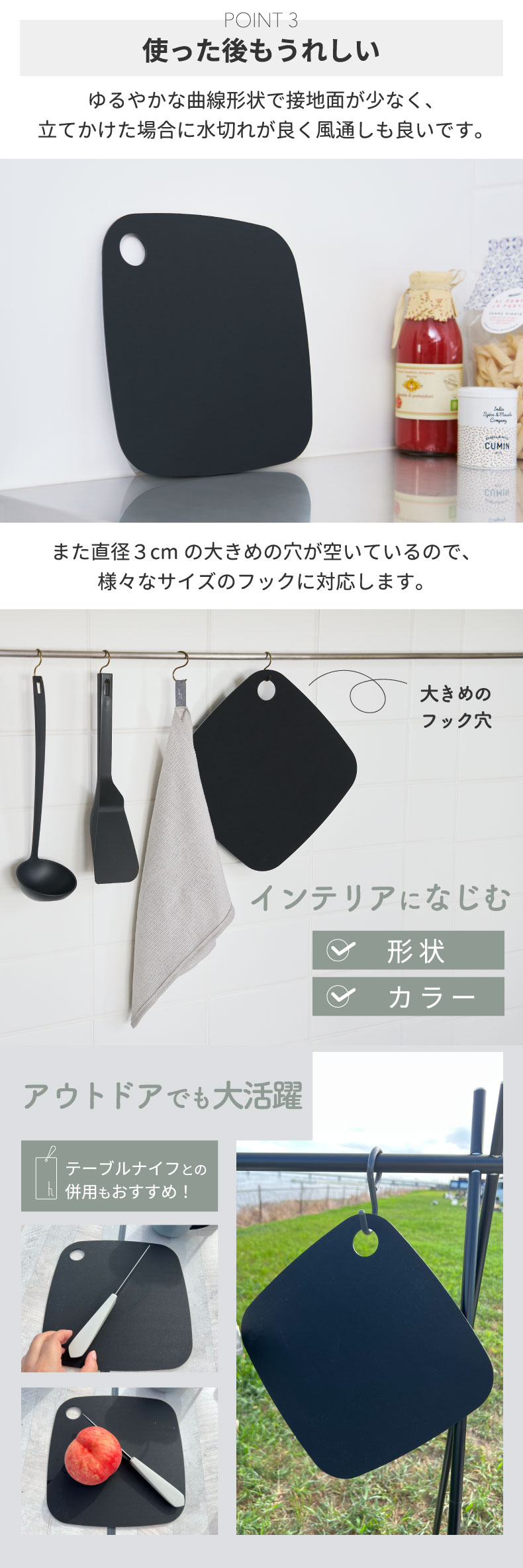 立てかけたり、吊るしたり、キッチンの目に留まる場所にあっても、インテリアになじむ形状と落ち着いた色です。