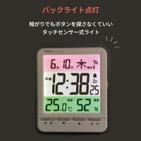 | 機能 | 電波時計、電波受信状況表示、電子音アラーム、スヌーズ、スヌーズ間隔任意設定(5〜60分)、タッチセンサー式ライト、カレンダー表示、温度表示(-9.9〜+49.9℃)、湿度表示(20〜95%RH)、12/24時間表示切替機能、3色カラー液晶表示 |