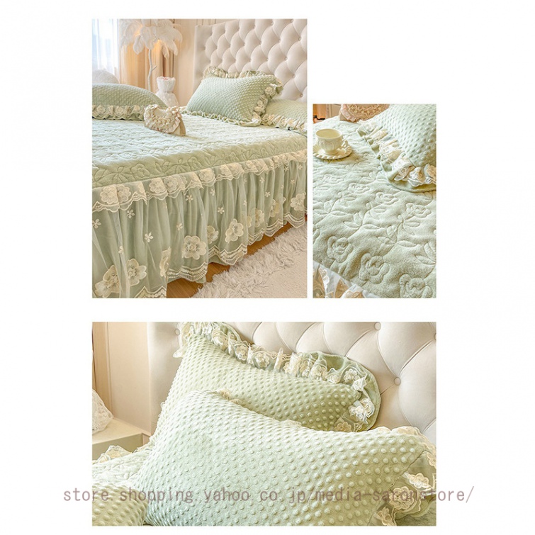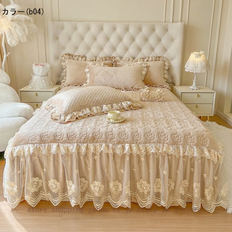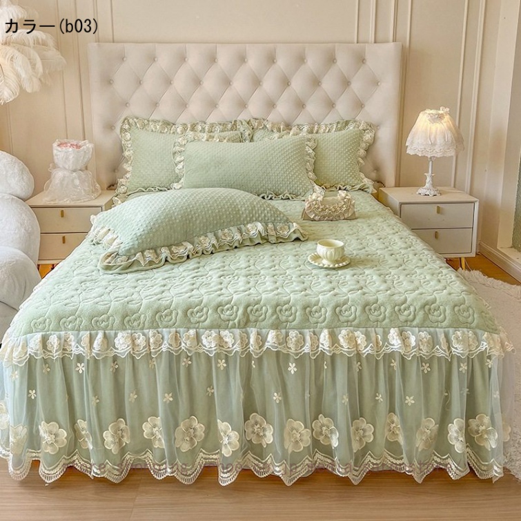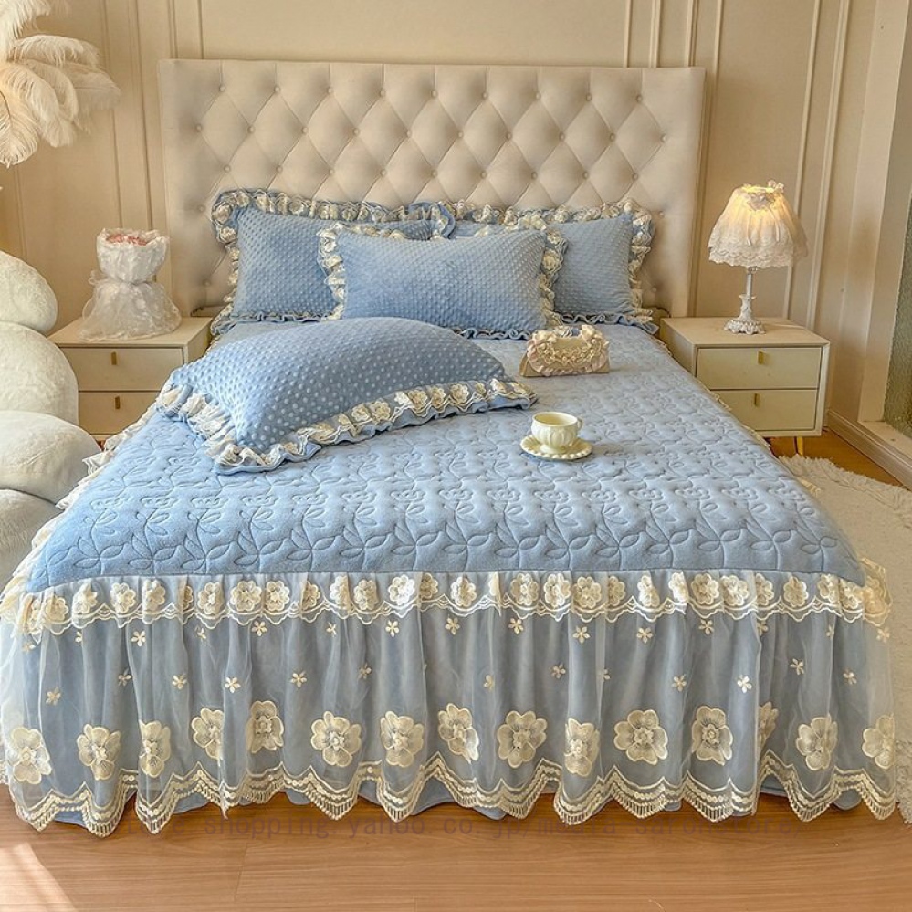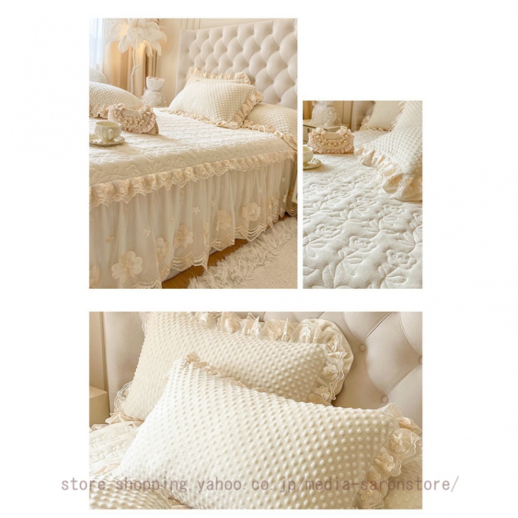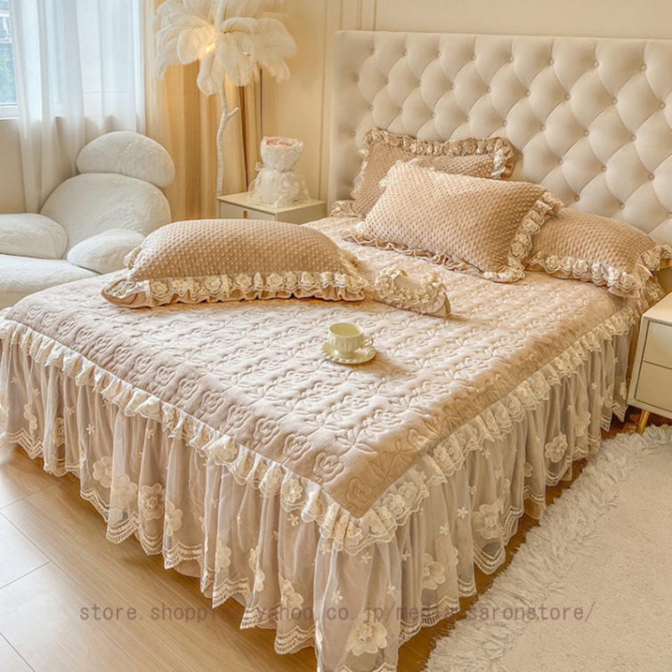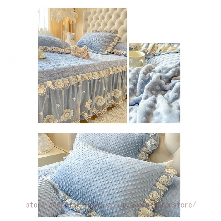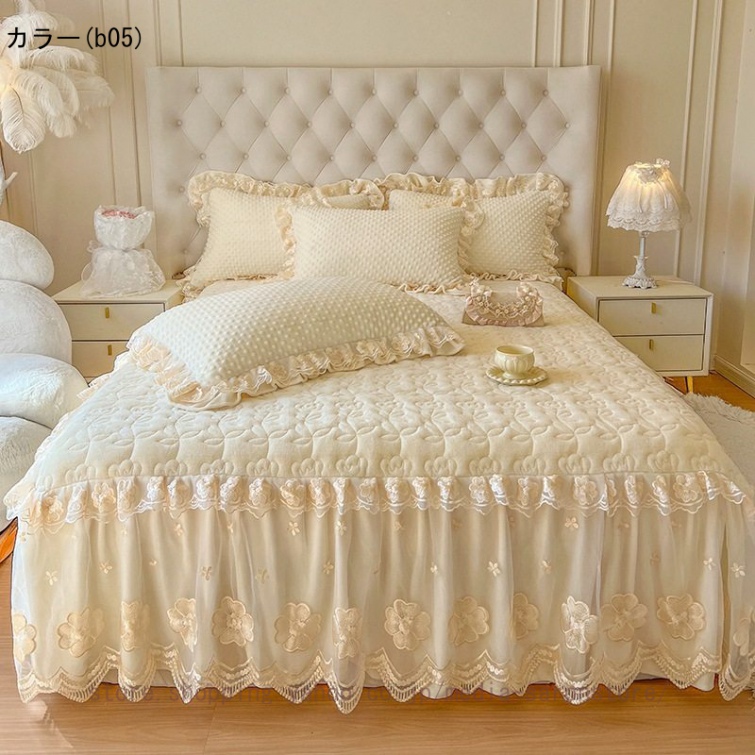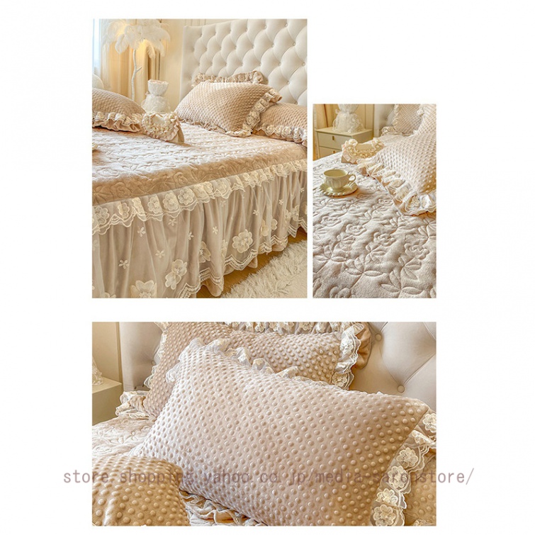 ベッドスカート 枕カバー 中綿 フランネル ふわふわ 暖かい 厚手 可愛い花レース 姫系 フリル ダブル クイーン 上品 きれいめ シーツセット ベッドカバー