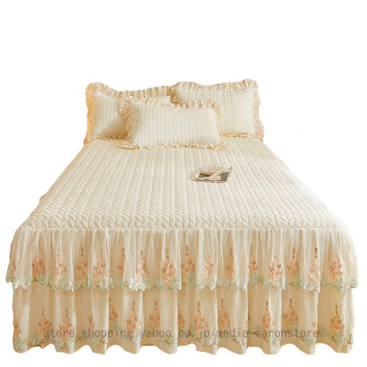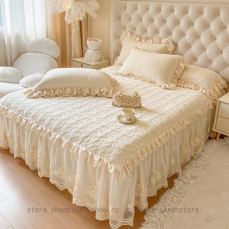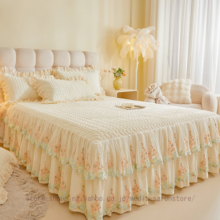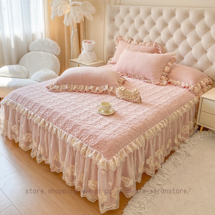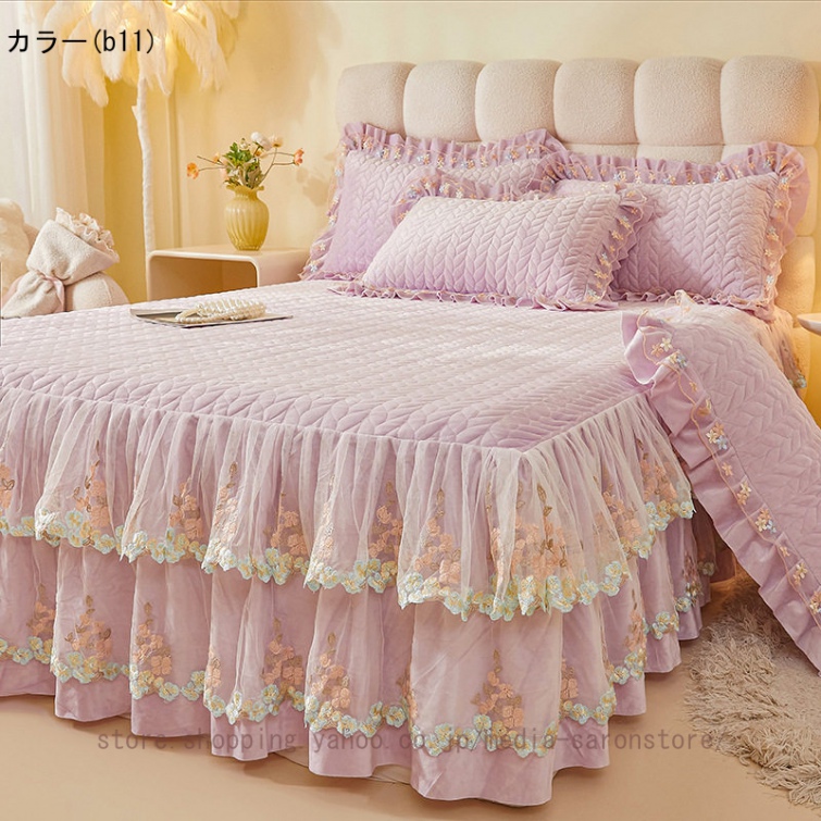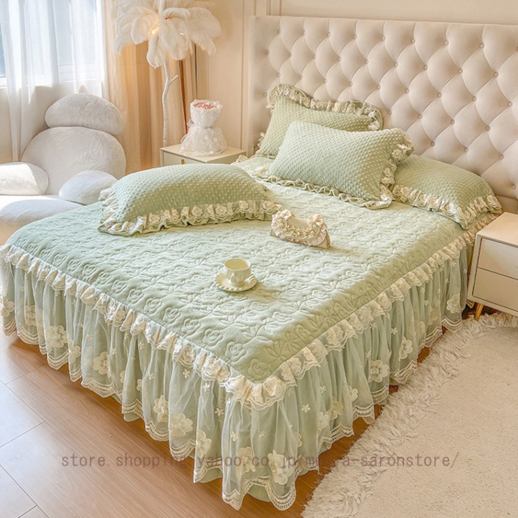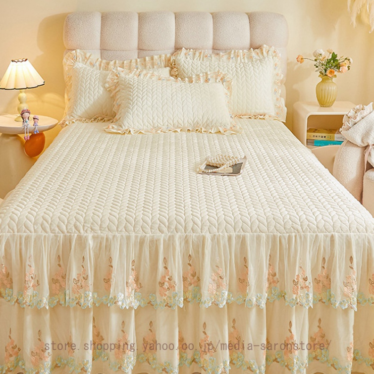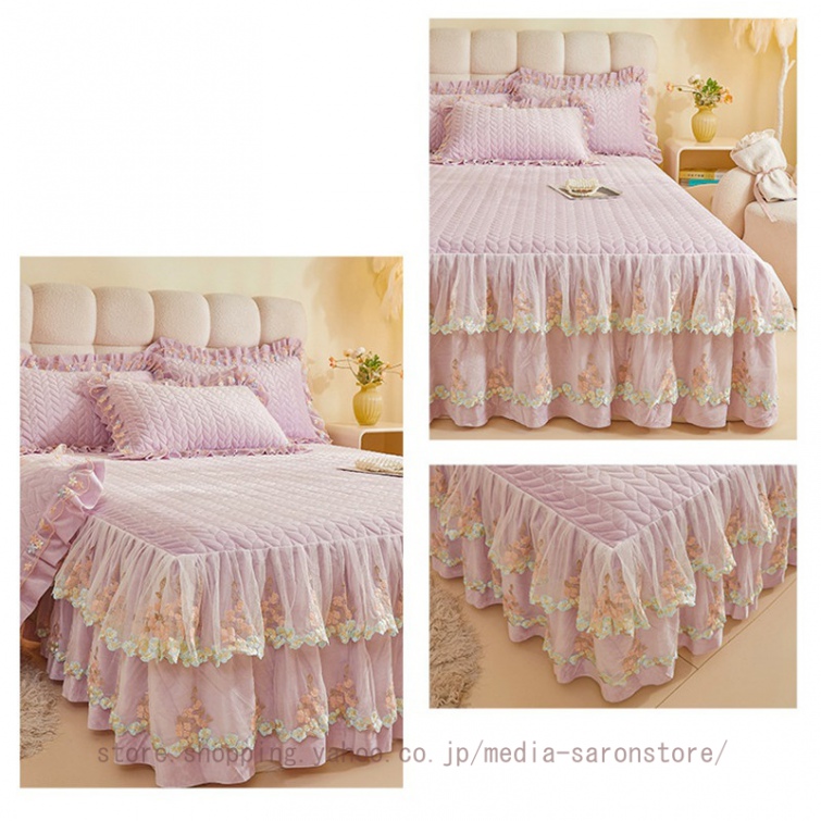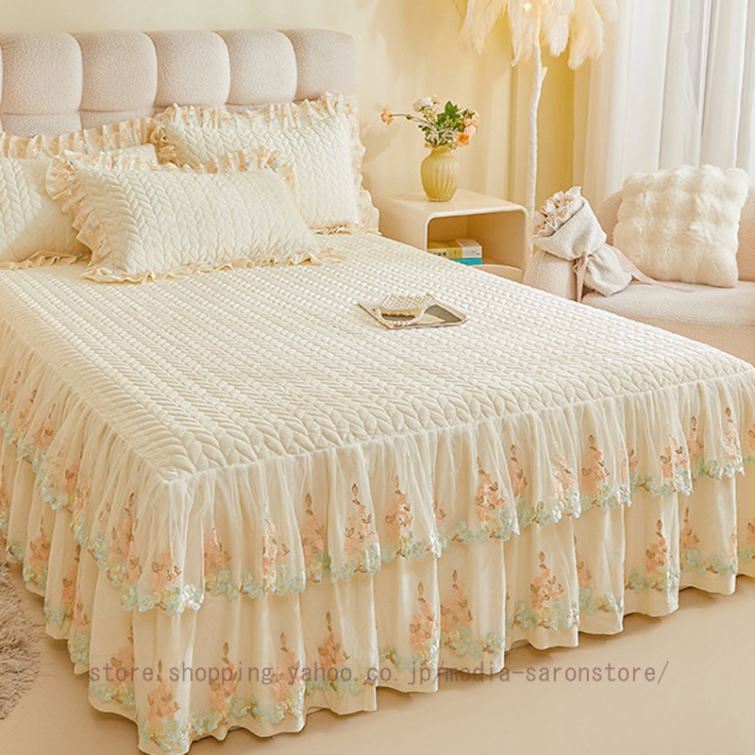 ベッドスカート 枕カバー 中綿 フランネル ふわふわ 暖かい 厚手 可愛い花レース 姫系 フリル ダブル クイーン 上品 きれいめ シーツセット ベッドカバー