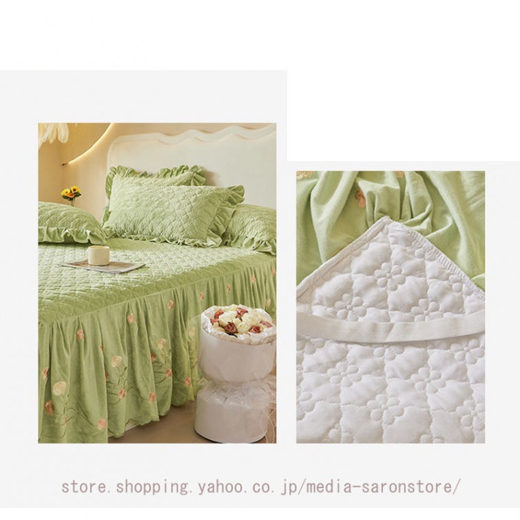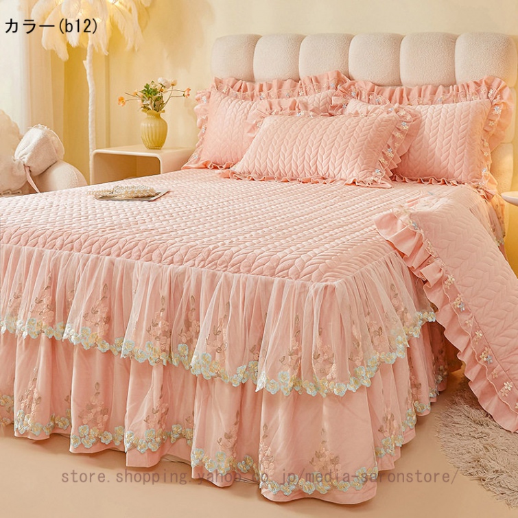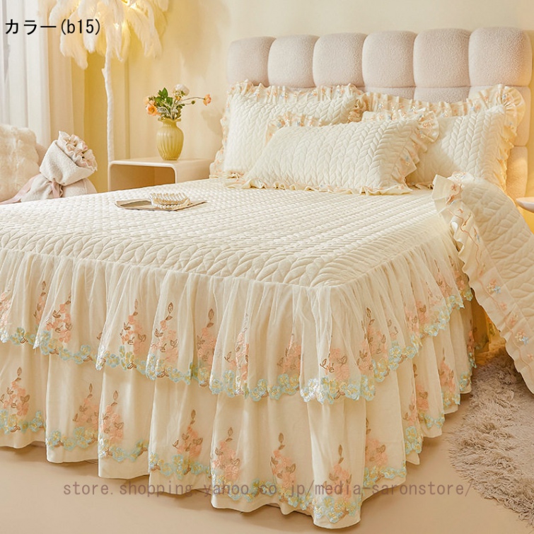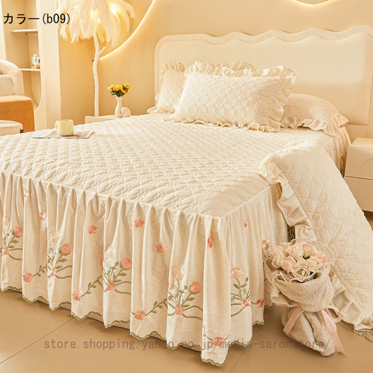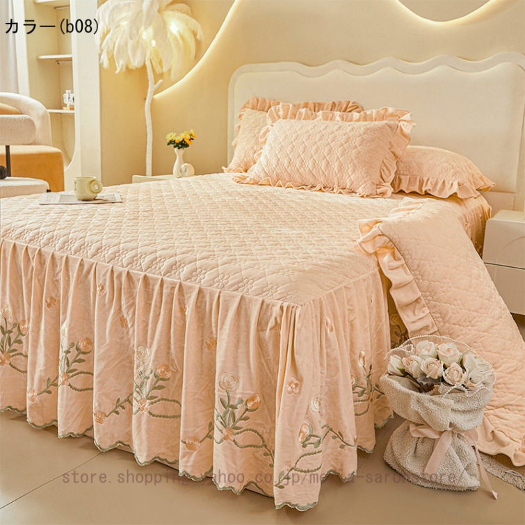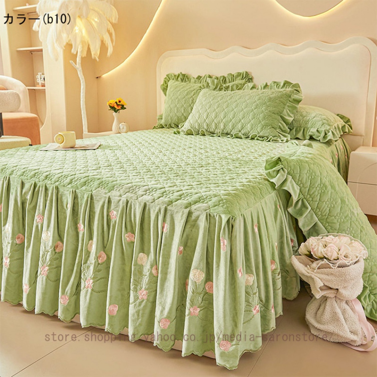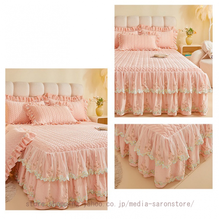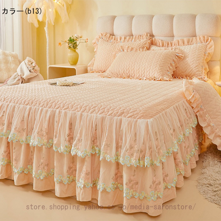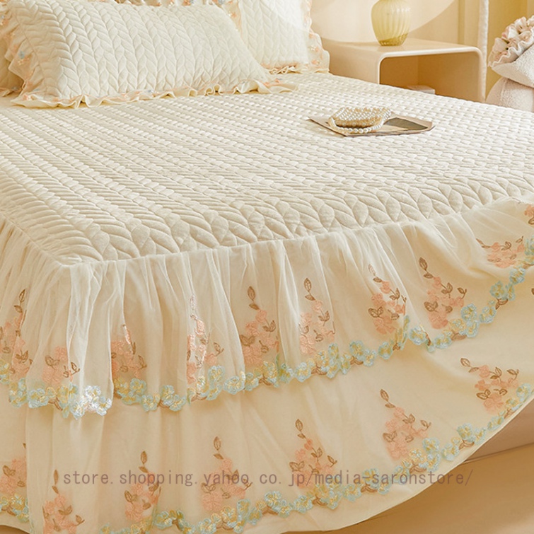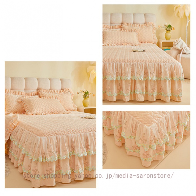 ベッドスカート 枕カバー 中綿 フランネル ふわふわ 暖かい 厚手 可愛い花レース 姫系 フリル ダブル クイーン 上品 きれいめ シーツセット ベッドカバー