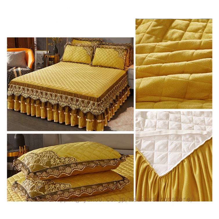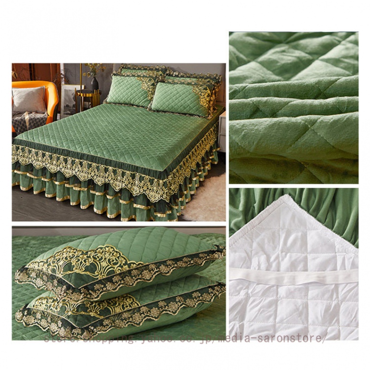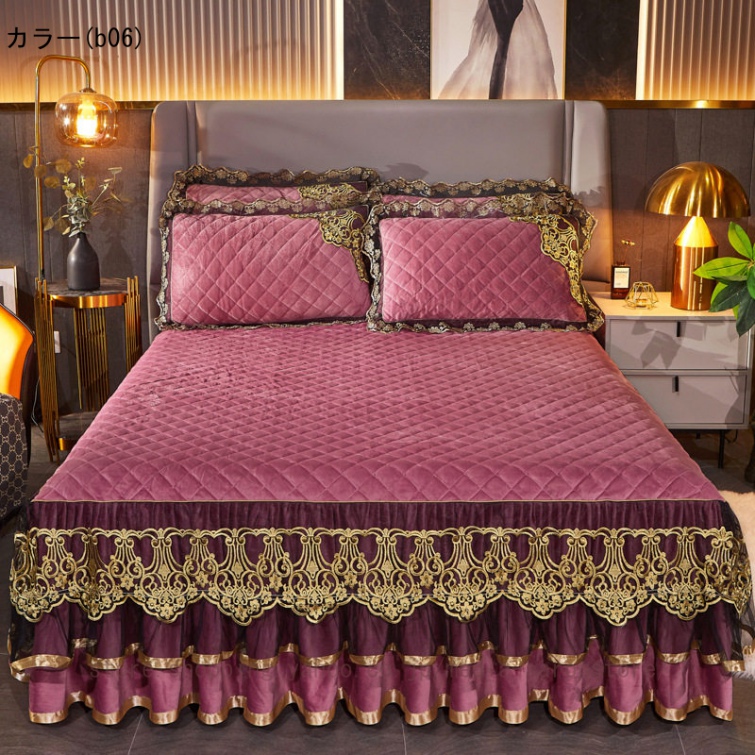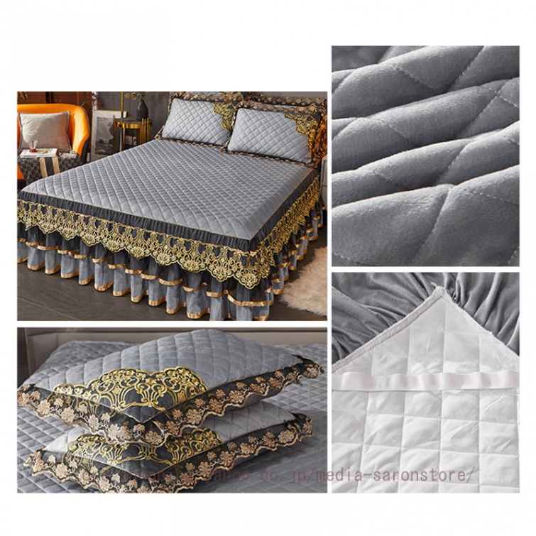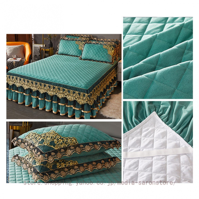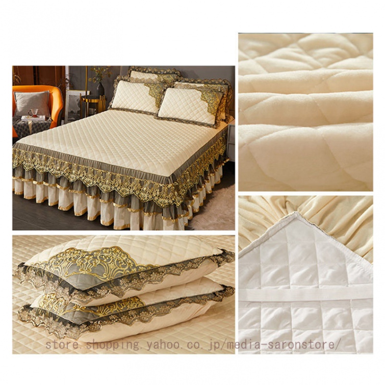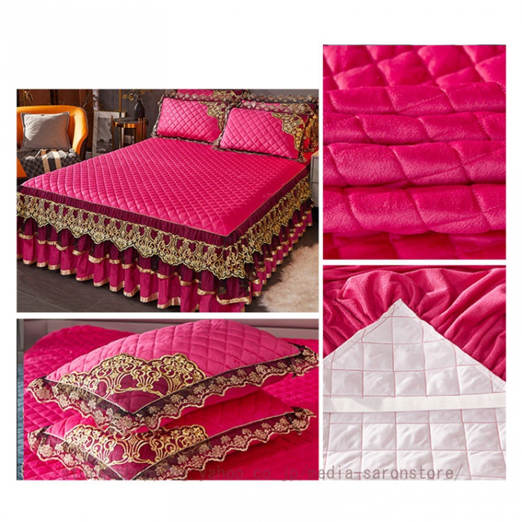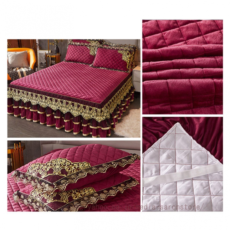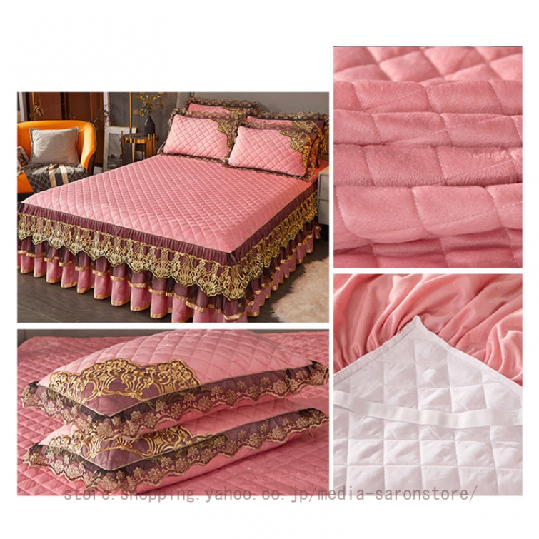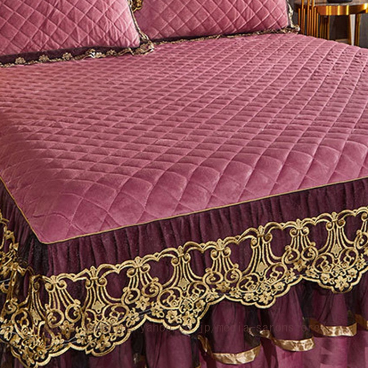 ベッドスカート 2点枕カバー 上品 フランネル キルティング 中綿 厚め ベッドカバー 秋冬 暖かい レース フリル 姫系 柔らか ダブル マットレスカバー