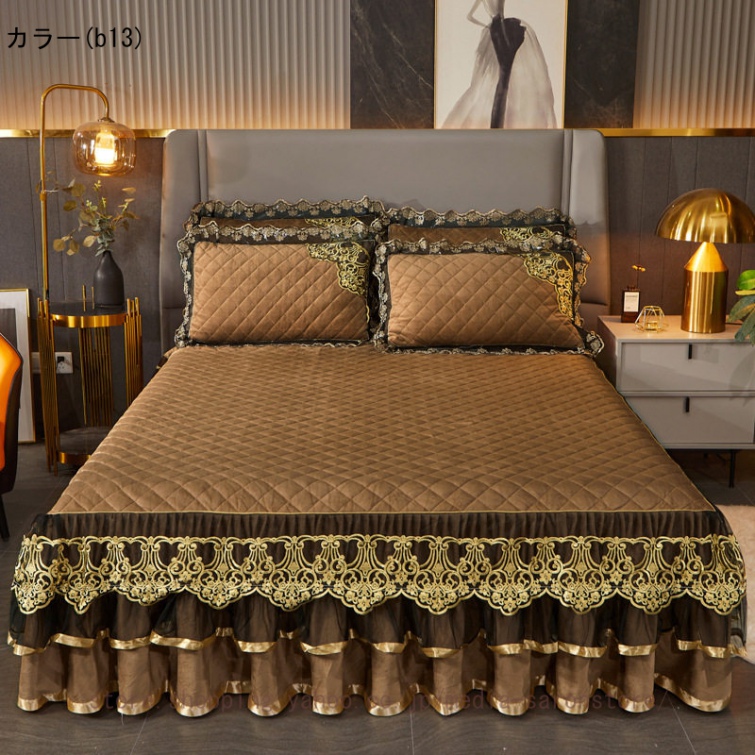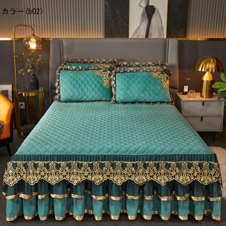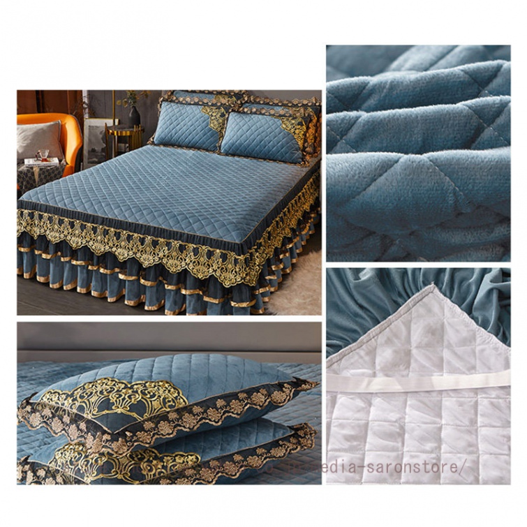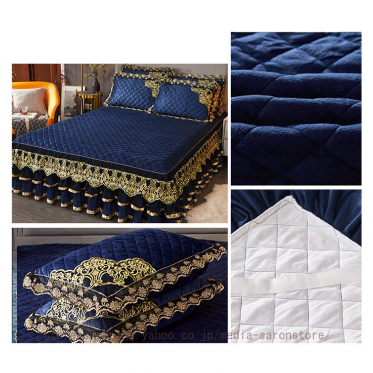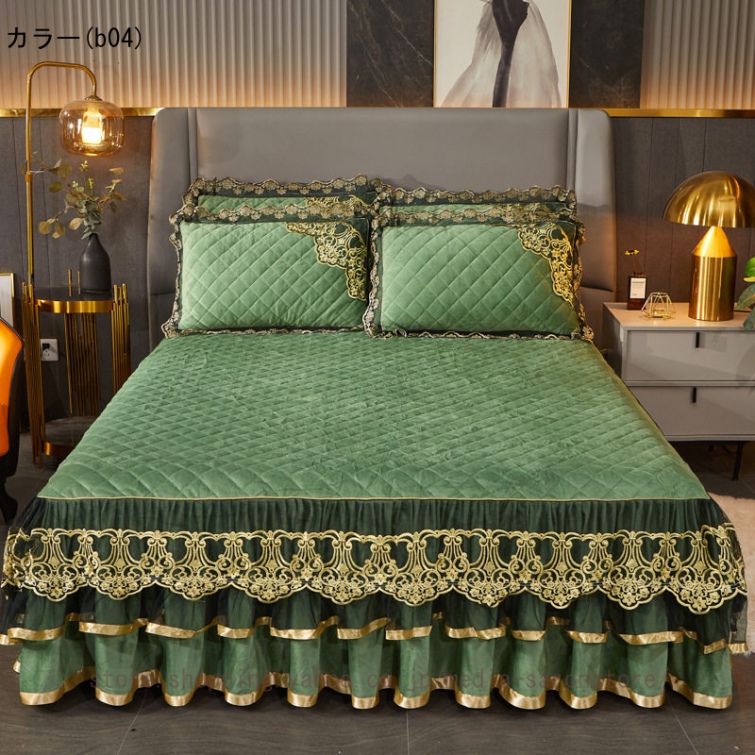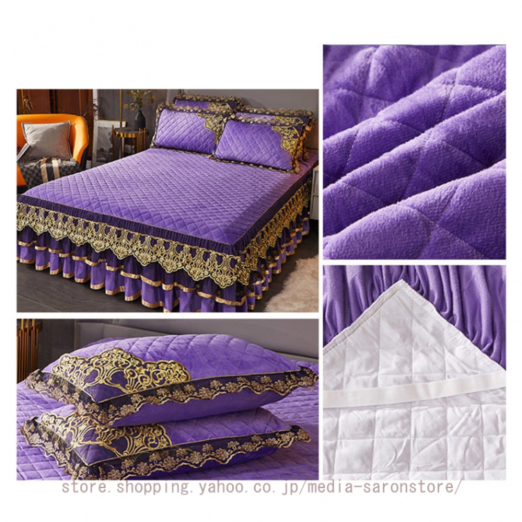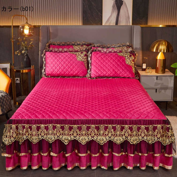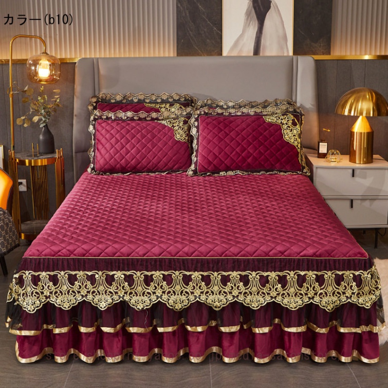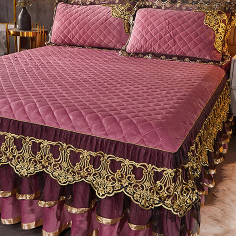 ベッドスカート 2点枕カバー 上品 フランネル キルティング 中綿 厚め ベッドカバー 秋冬 暖かい レース フリル 姫系 柔らか ダブル マットレスカバー